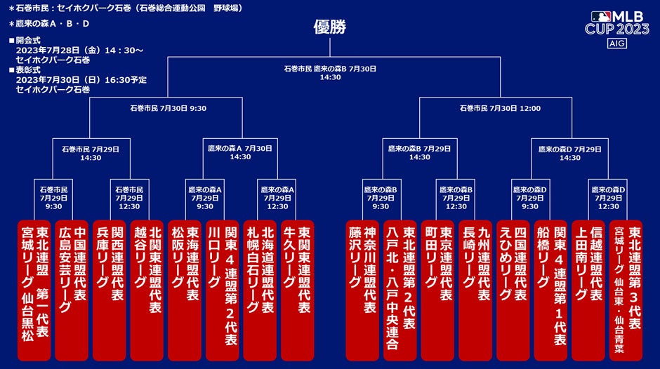 AIG presents MLB CUPは、次世代を担う野球少年・少女に夢を与え、野球人口拡大に繋がる普及プログラムを創る目的で創設された、小学4年生・5年生を対象とした野球大会です。毎年ファイナルラウンドは、各地区の予選を勝ち抜いたチームが復興支援の一環として宮城県石巻市に集まり開催されています。今年は5月4日から6月25日まで、全国11地域で地区大会を開催し16チームがファイナルラウンドへ進出しました。7月28日に開会式、7月29日、30日にセイホクパーク石巻、 鷹来の森運動公園の2会場でファイナルラウンドが実施されます。その様子はスポーツナビ(https://sports.yahoo.co.jp/livestream/mlbjapan)でのライブ配信を予定しております。
