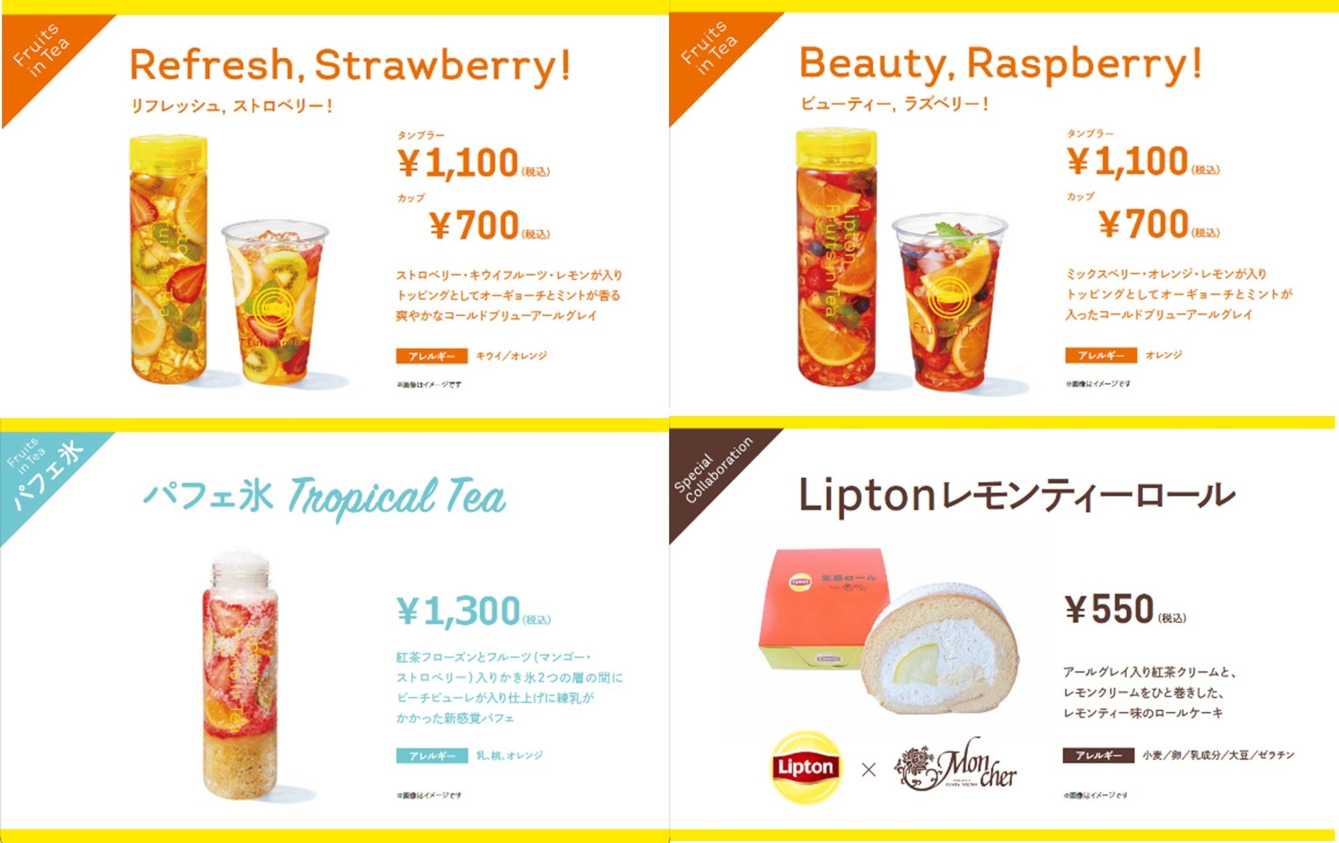 株式会社 Mon cher (モンシェール 本店:大阪市北区、代表取締役:金美花)が展開する、パティスリーモンシェール札幌円山店、リヴァージュモンシェール納屋橋店、メルシーモンシェール岡山店の3店舗で「リプトン フルーツインティー」のコラボメニューを販売いたします。