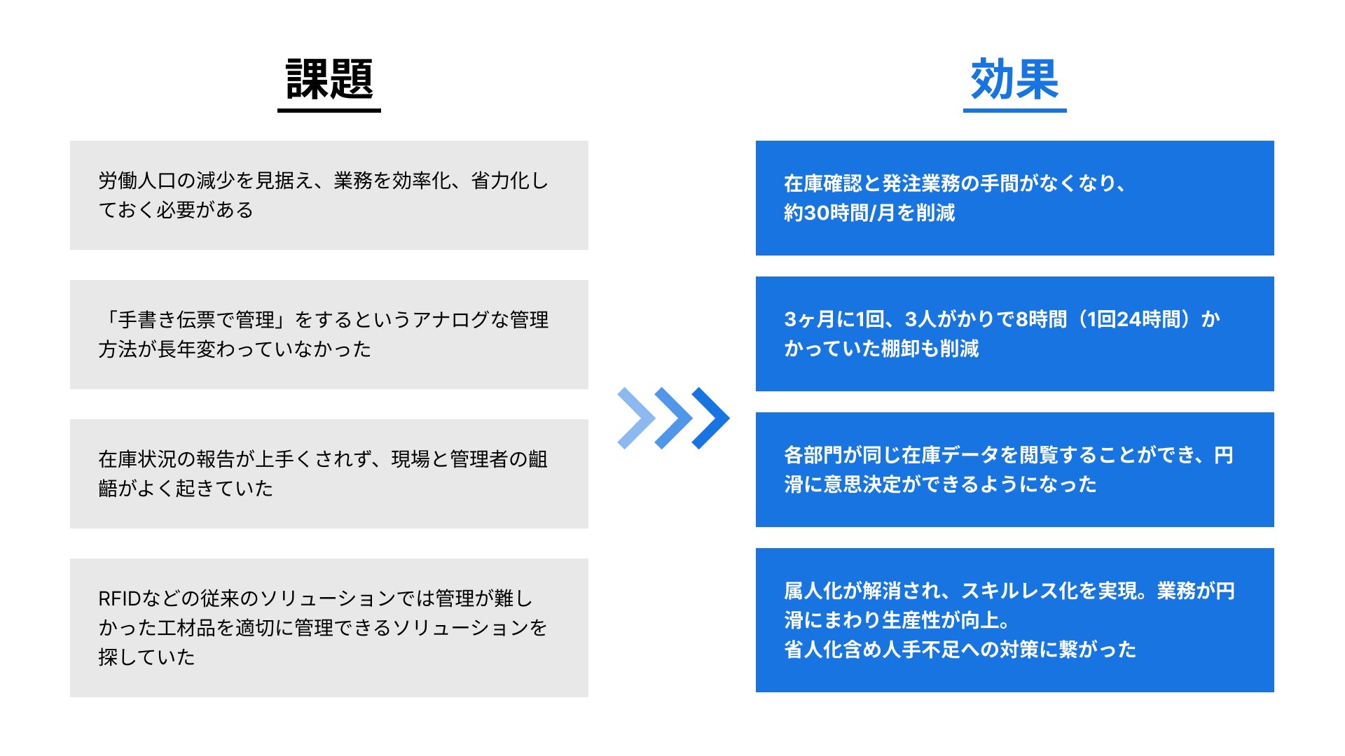 長年放置していた紙ベース管理の課題を解消し、在庫管理・発注作業の工数を約30時間/月 削減。労働力不足やスキル継承などの体制リスクの軽減にも貢献