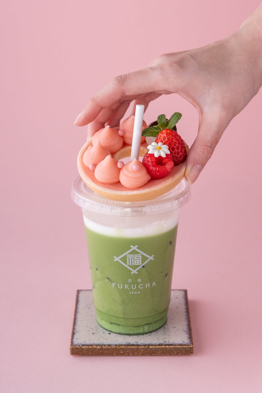 FUKUCHAで人気の抹茶ラテにドーナツの形をした最中スイーツを乗せた、ハイブリッドなスイーツドリンクです。