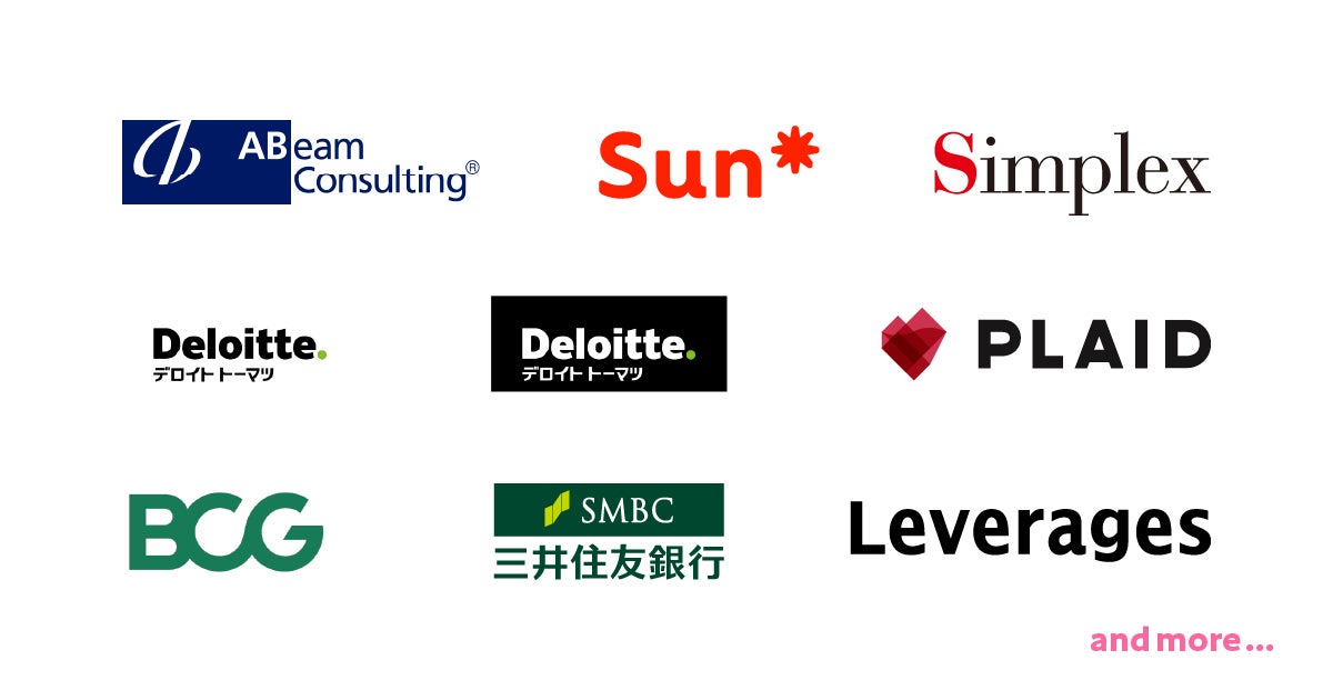 アーサー・ディ・リトル・ジャパン / アビームコンサルティング / Sun Asterisk / GA technologies / J.P.モルガン / シンプレクス・ホールディングス / デロイトトーマツコンサルティング / デロイト トーマツ ファイナンシャルアドバイザリー / 野村総合研究所 / PwCアドバイザリー / PwC Strategy& / プレイド / P&Gジャパン / ボストン コンサルティング グループ / 三井住友銀行 / 三菱UFJリサーチ&コンサルティング / モルガン・スタンレー / レバレジーズ(50音順)