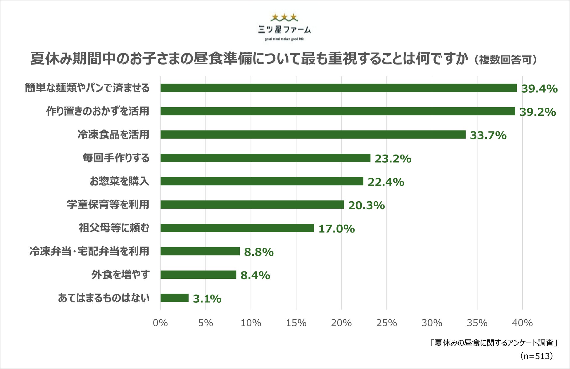 ・夏休み中の昼食には「パン・麺類」(39.4%)や「作り置きおかず」(39.2%)「冷凍食品」(33.7%)など、調理時間がかからないような工夫をしていることが判明