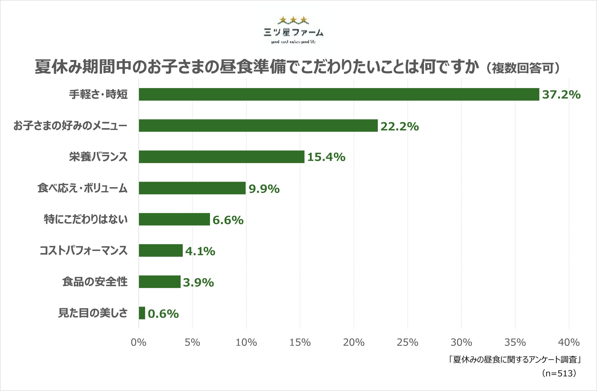 ◆夏休みのお昼ごはんは「手軽さ・時短」重視が約40%。一方でお子さまの好みのメニューや栄養バランスを気にする声も多数
