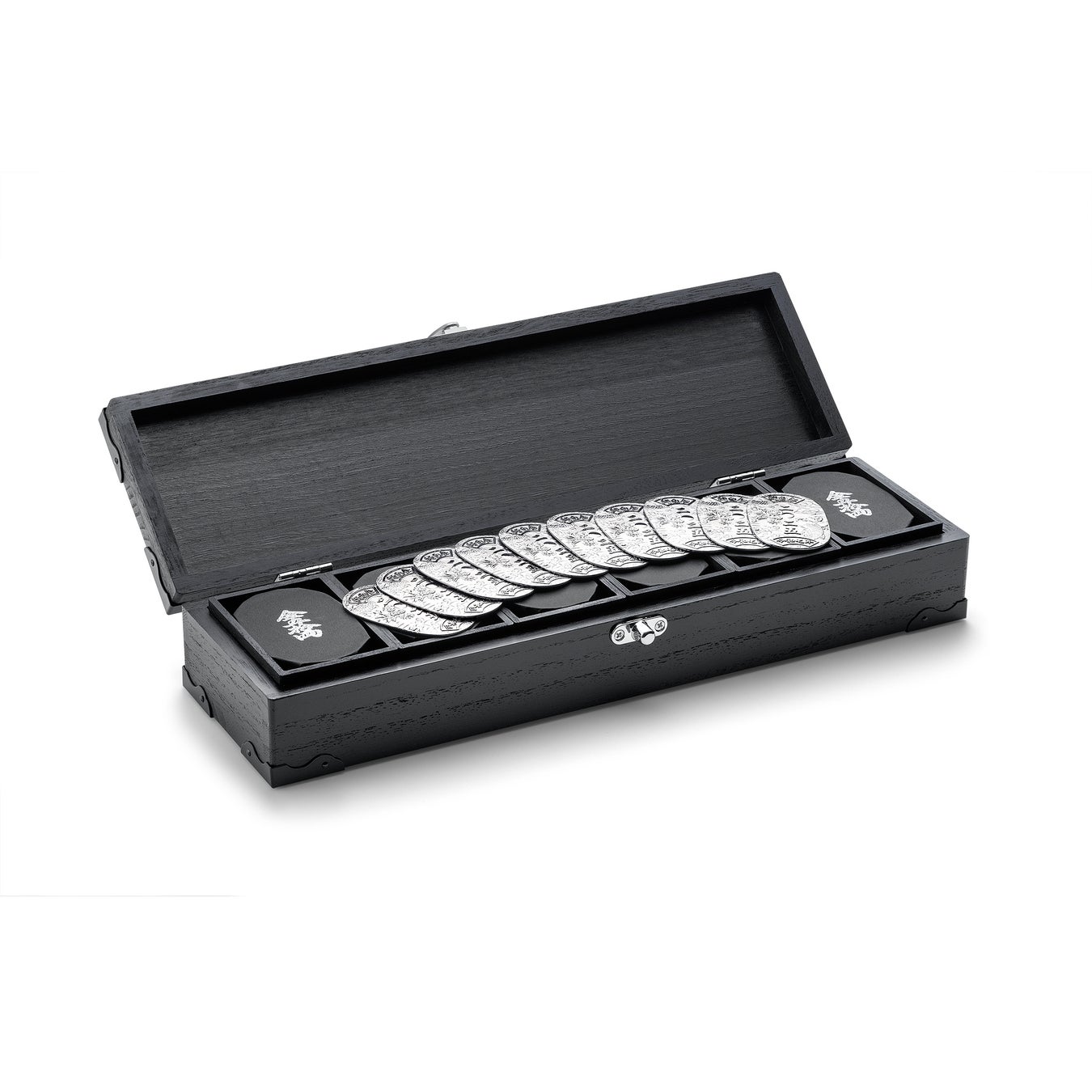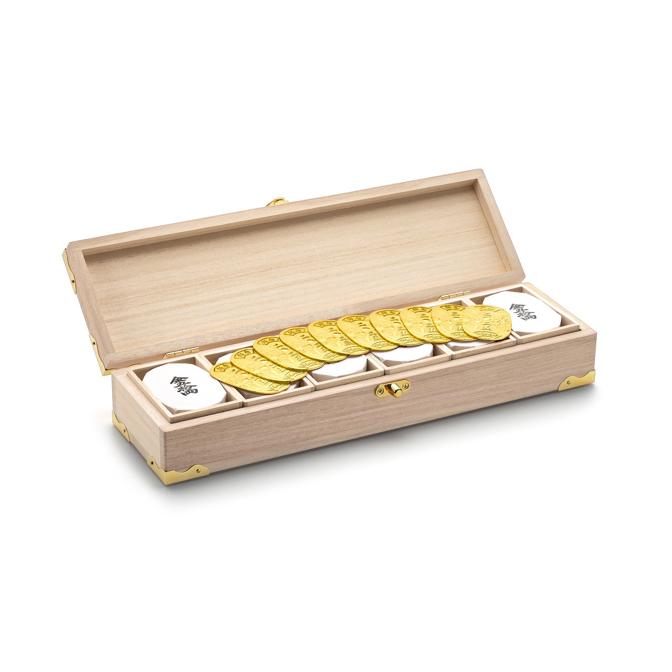 鯉は、流れに逆らって泳ぐ性質から「勇気や忍耐」の象徴とされており、困難に立ち向かう姿勢から「繁栄と成功」にご利益があると言われています。鯉と向かい合うように配置した龍は純金小判の人気のモチーフで、邪気を払い、「繫栄や幸運」をもたらす守護神であると考えられており、天空を昇っている姿から気運の上昇をもたらす縁起物としても知られています。様々な願いを叶えてくれると言われる「如意宝珠」(にょいほうじゅ)を年号2025の”0”(ゼロ)に見立て、龍が今にも如意宝珠を掴みそうな臨場感あふれる構図としました。純金製、純プラチナ製で龍と鯉の配置を反転させており、コレクションとしてセットで購入する方のニーズにも対応します。また、「純金小判 2025」、「純プラチナ2025」をそれぞれ10枚セット、30枚セット、50枚セットにした千両箱も同時に発売します。