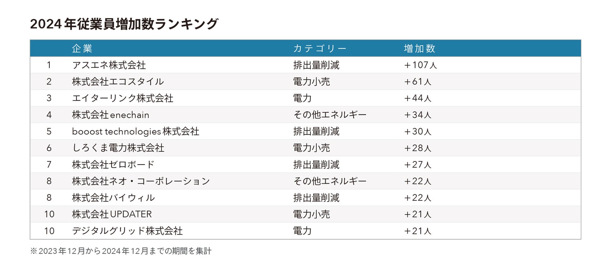 エネルギー分野スタートアップ 従業員増加数ランキング(2024年)