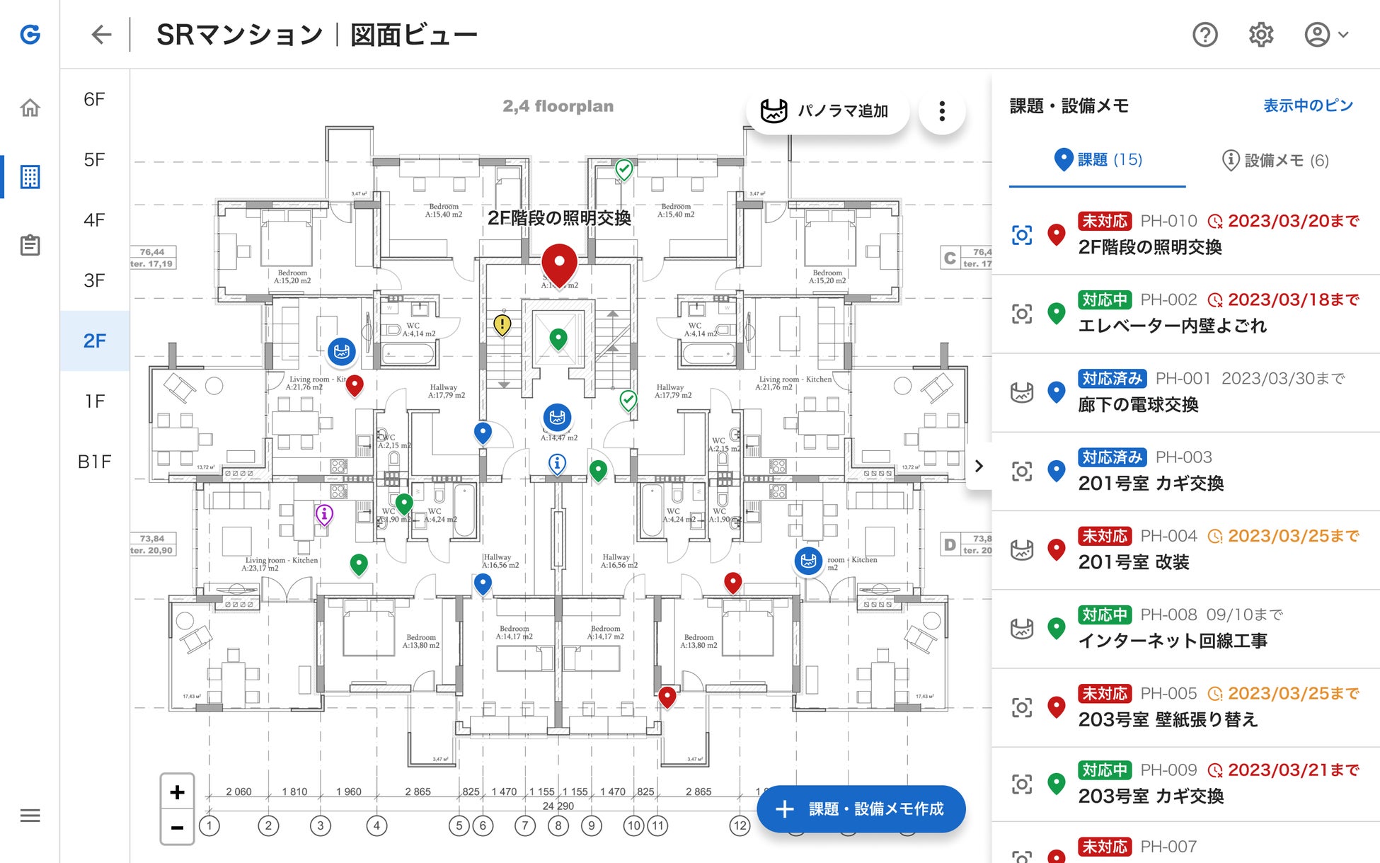 図面に課題、設備情報のピンが打てるようになり、図面上でピンの絞り込みが可能になりました。図面上でピンの種別で即時状況を把握することができます。