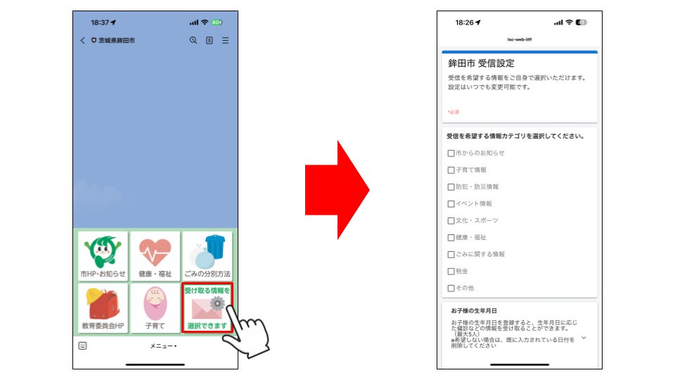 メニューの右下「受け取る情報を選択できます」ボタンより、受信を希望する情報の選択を行うことができます。