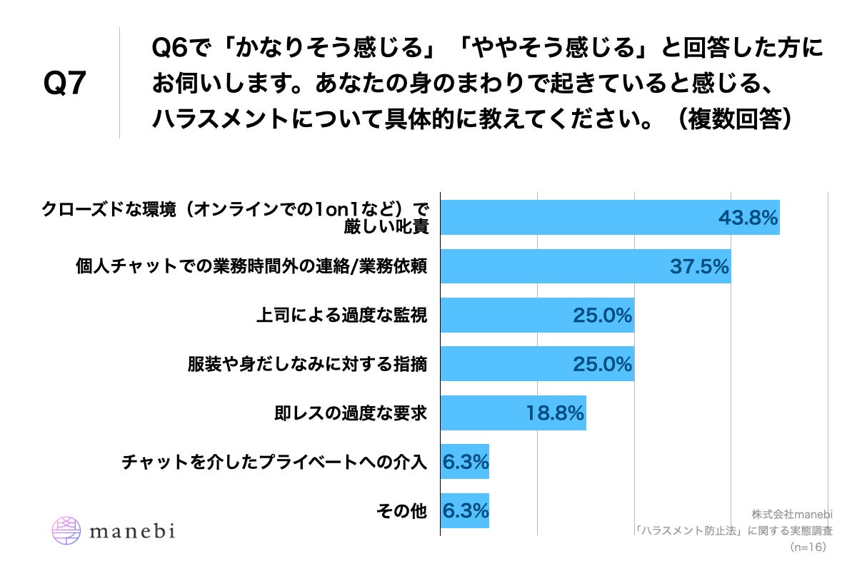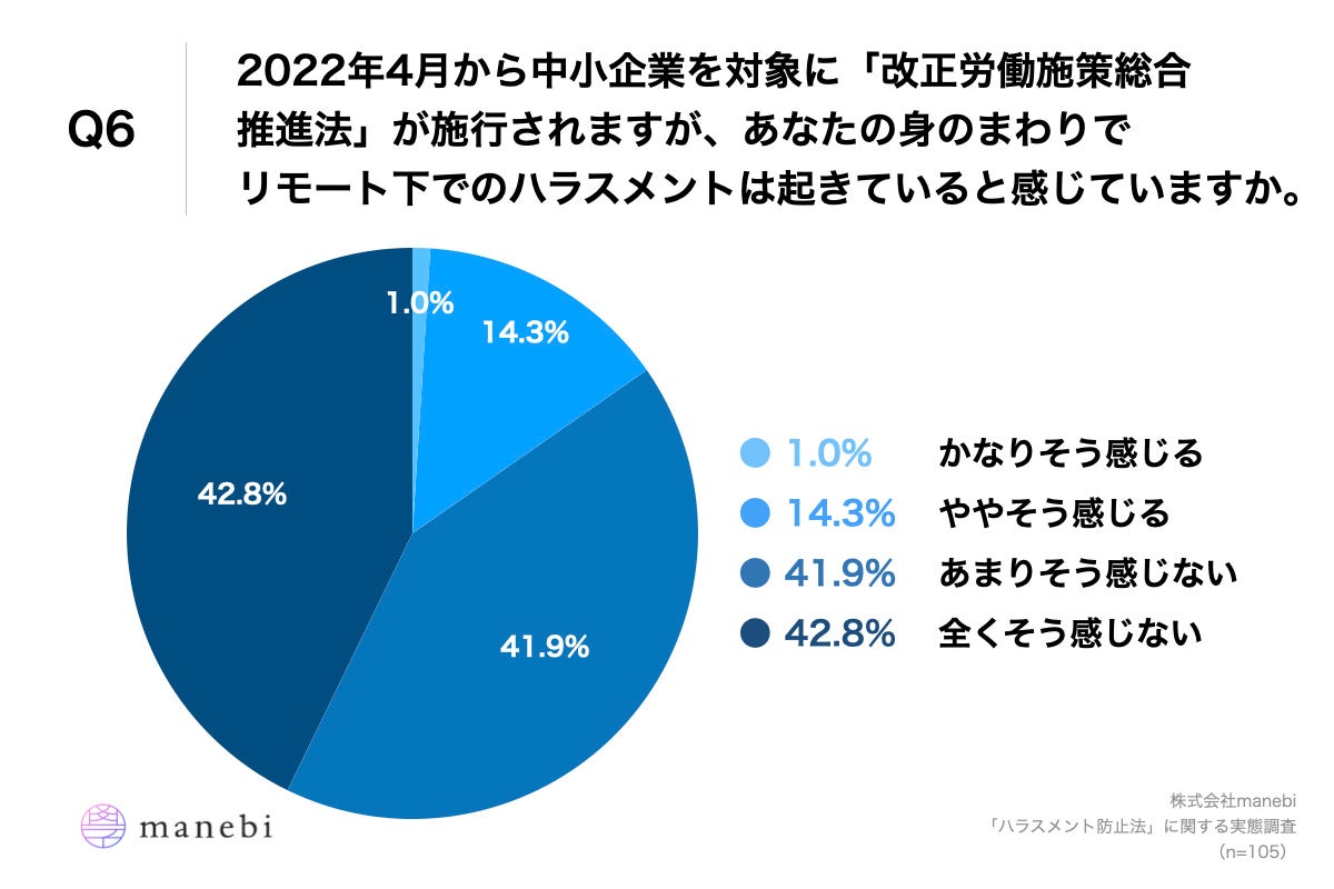 株式会社manebi(東京都千代田区、代表取締役執行役員CEO:田島 智也)は、従業員数30~300名の22〜29歳の会社員(一般社員・人事以外)105名を対象に、「ハラスメント」に関する実態調査を実施いたしましたので、お知らせいたします。