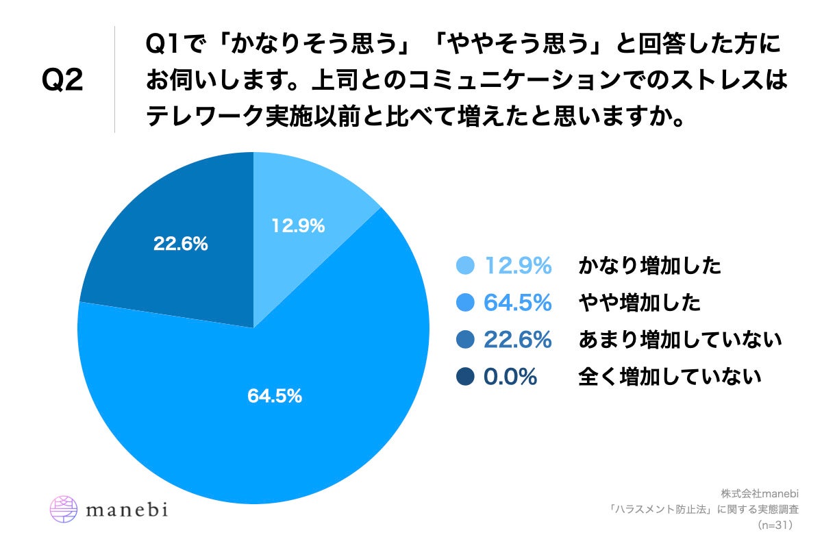 - 約8割が、上司とのコミュニケーションでのストレスは、テレワーク実施以前と比べて「増えた」と回答