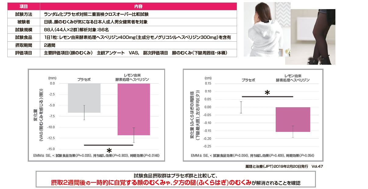 1)顔のむくみ感や脚のむくみを軽減するレモン由来モノグルコシルヘスペリジンを配合。