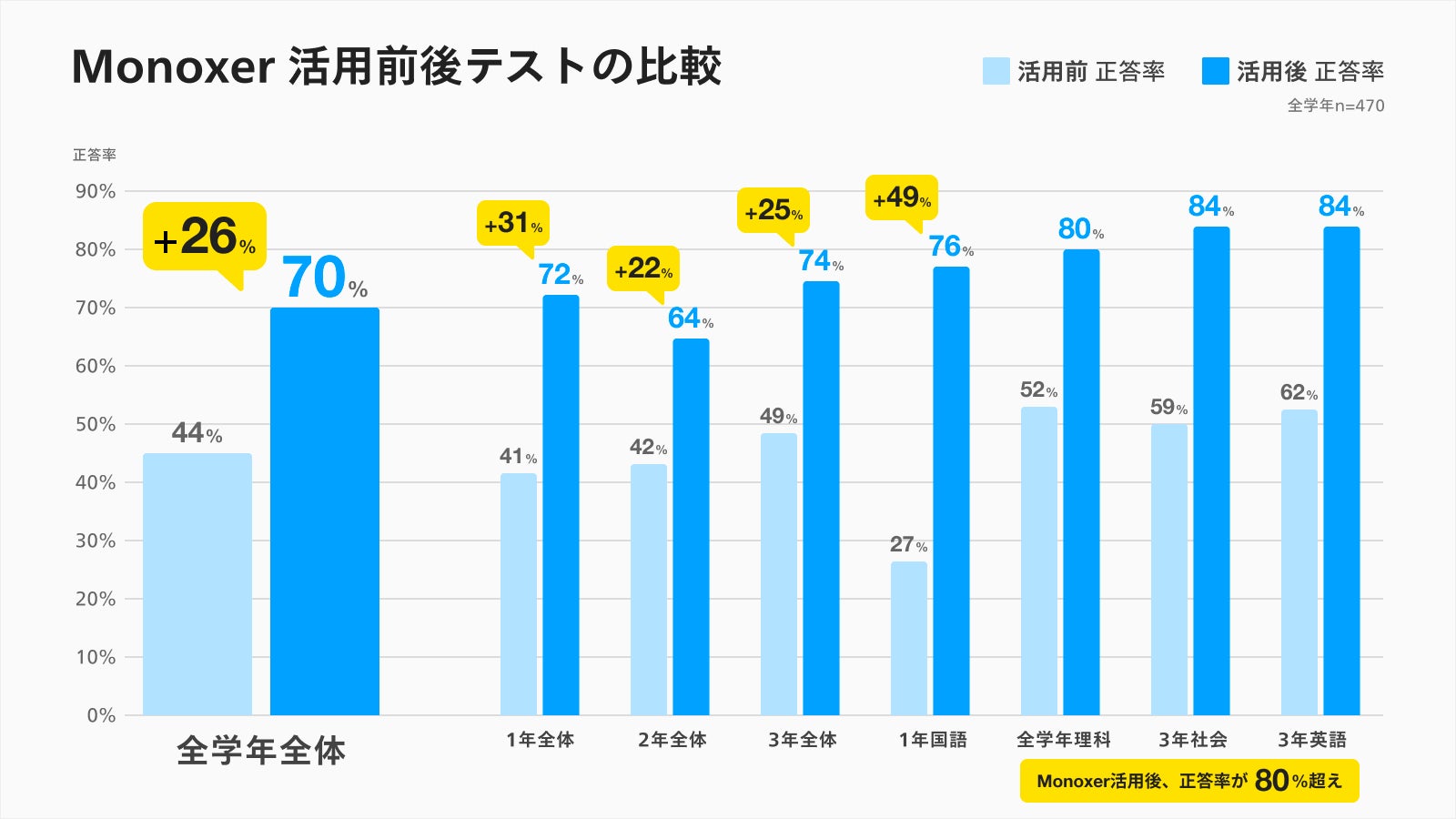 墨田区立桜堤中学校で「Monoxer」活用後、生徒470名の主要5科目の基礎事項テストの平均得点率が44%から70%へ上昇