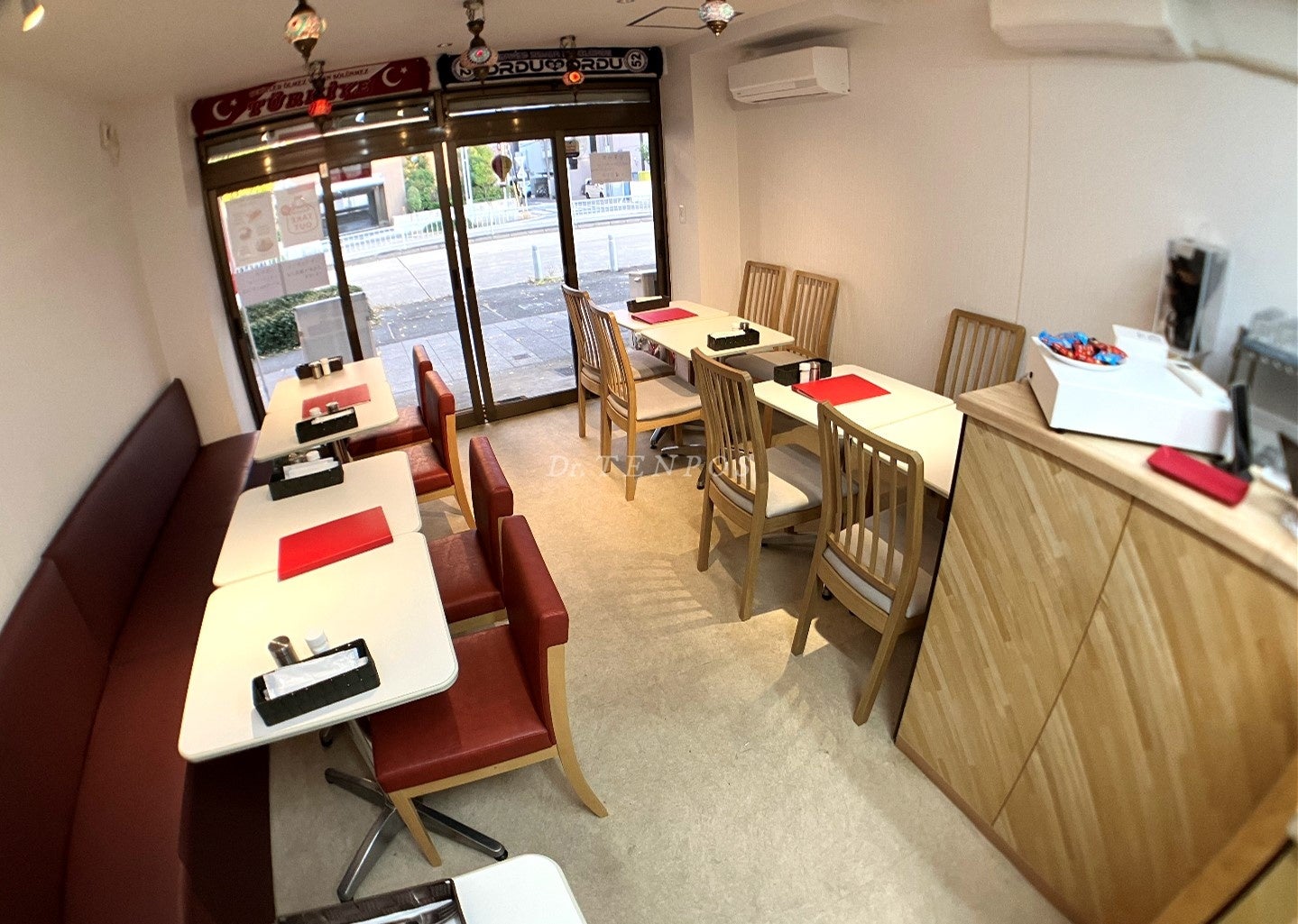 かつてとんかつ店だった店内は、赤と白を基調とした明るいダイニング空間に一新されました。トルコの伝統的な照明をアクセントに使用し、異国情緒あふれるおしゃれな空間で食事が楽しめます。