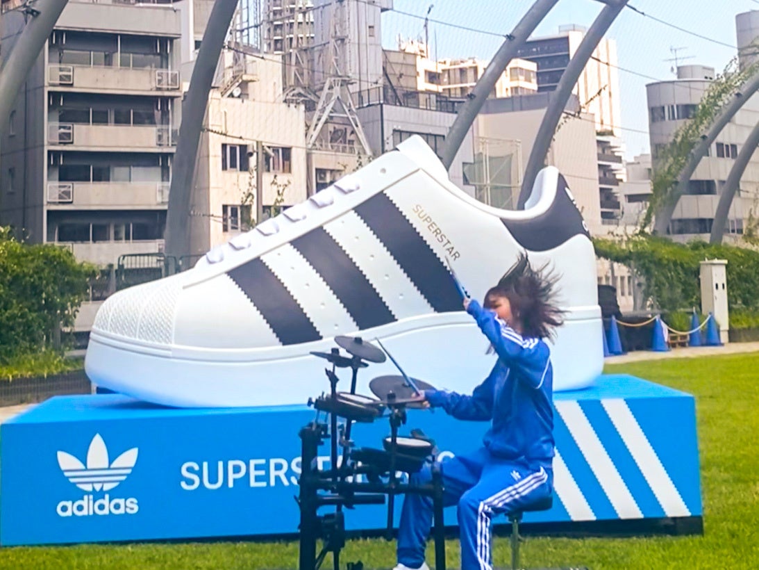 「憧れのadidasとのコラボ企画と聞いた時はとっても興奮しました🔥しかも歴史あるSUPER STARと自身のドラムパフォーマンスを掛け合わせた撮影で、めちゃくちゃ嬉しかったです!!関わってくださったみなさまに感謝の気持ちでいっぱいです!!」