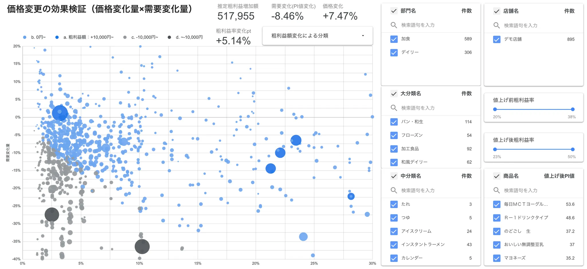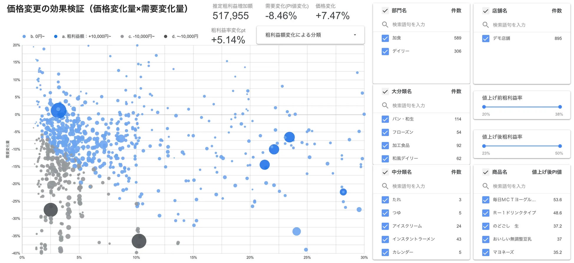 【概要】複数の商品の価格変更前の販売実績と価格変更後の販売実績に基づき粗利の変化を分析し、粗利への影響の可視化が可能となります。