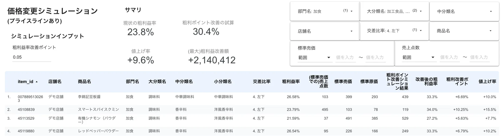 【概要】粗利目標を設定すると商品グループごとに価格変更シミュレーションを行うことで、粗利目標に応じた価格変更を一括で出力できます。