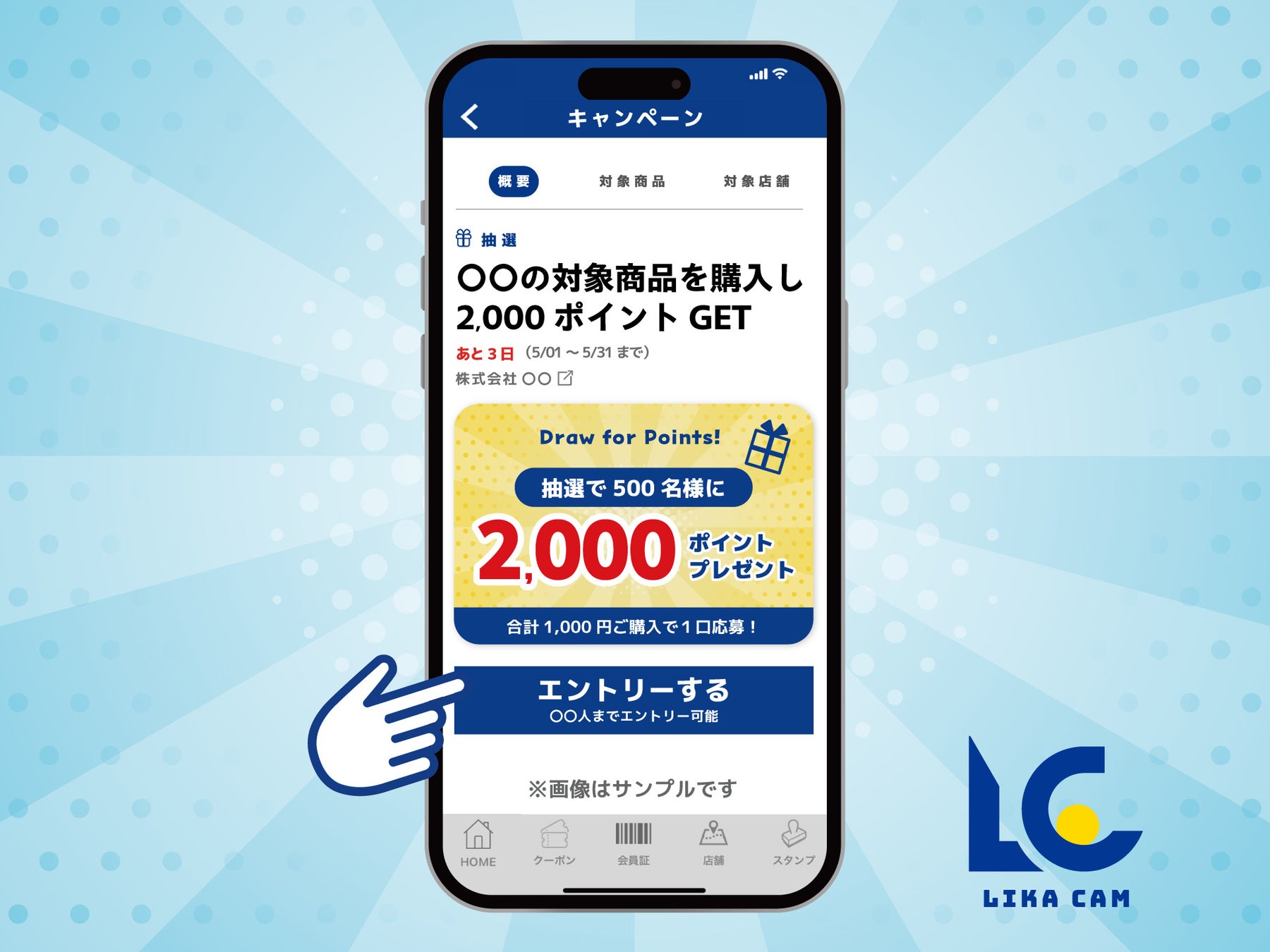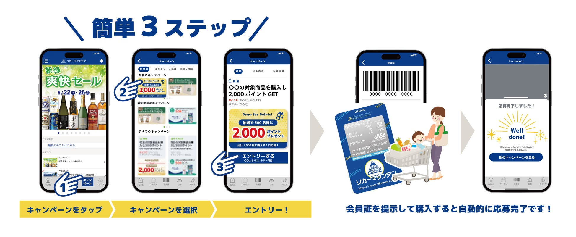 公式アプリ「リカマンアプリ」に新たに搭載されたキャンペーン機能です。これまで、はがきやウェブフォームで行っていたキャンペーンを本サービスに集約することで、エントリーから当選時のポイント付与まで、全てアプリ内で完結できるようになりました。さらに、従来は煩雑だった応募作業も、最短3クリックで完了するストレスフリーな設計となっています。今後、リカキャンから様々なキャンペーンを行い、たくさんのポイントを還元してまいります。