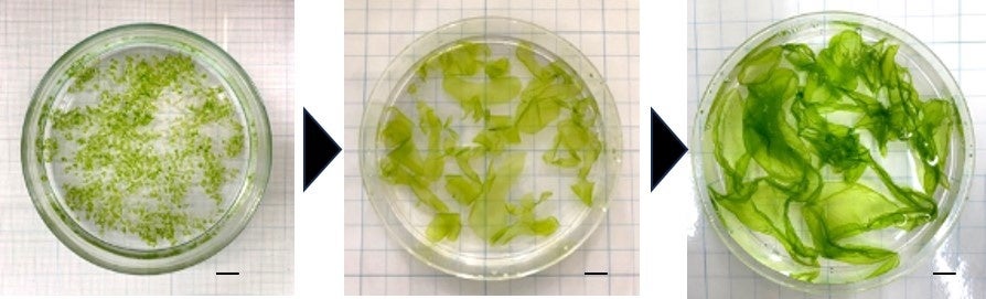 これらの知見をもとに、理研食品と高知大学は、ヒトエグサを単細胞のままで増殖させるバクテリア(細菌A)と、単細胞から葉状化を促進させるバクテリア(細菌B)を選定しました。これによって、単細胞状態で大量に増殖させたヒトエグサを葉状化させて、陸上養殖用の種苗としての活用が可能となりました(Kinoshita et al. 2022, Cytologiaに関連する研究成果を発表)。