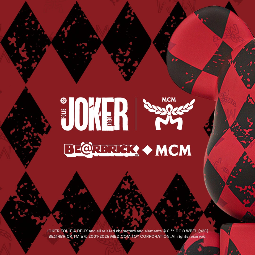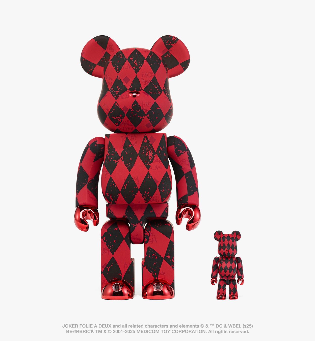 ハーレイ・クインを象徴する真紅のダイヤ柄に、MCMのヴィセトスモノグラムを組み合わせたBE@RBRICK。100%と400%の2サイズセットで展開。