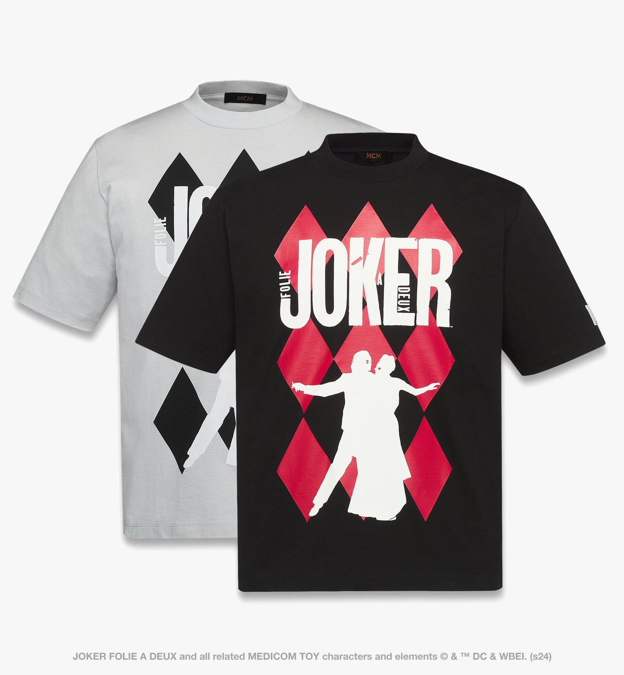 映画『ジョーカー:フォリ・ア・ドゥ』にインスパイアされた、DCキャラクターのジョーカーとハーレイ・クインが踊るシルエットとオフィシャルロゴがプリントされた日本限定のユニセックスTシャツ。WHITEとREDの2色セットで展開。