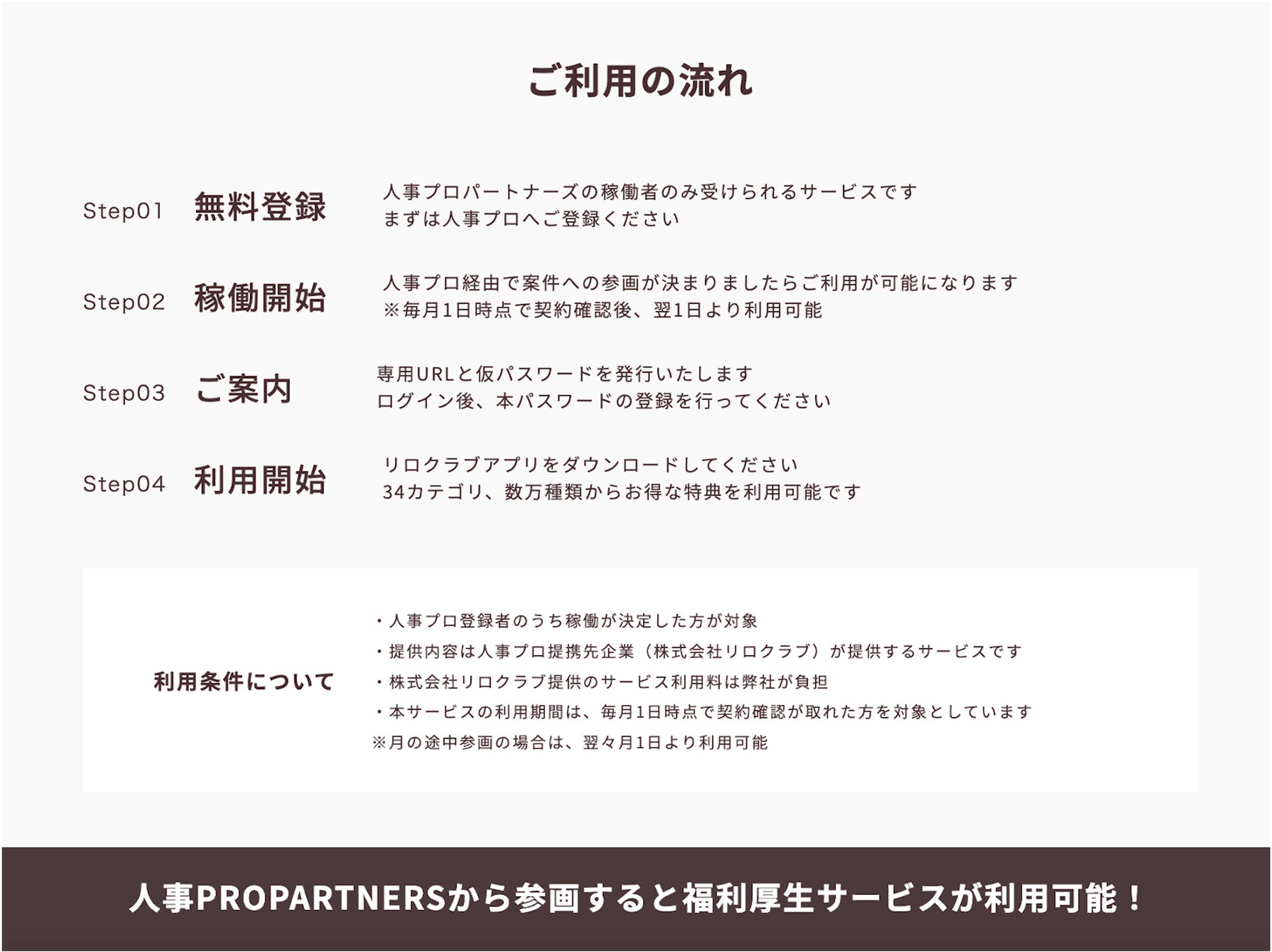 弊社にて稼働頂く皆様に少しでもワークライフバランスの実現、自己啓発をサポートさせていただきたく福利厚生プログラム「人事PRO PARTNERSベネフィット」を開始しました。
