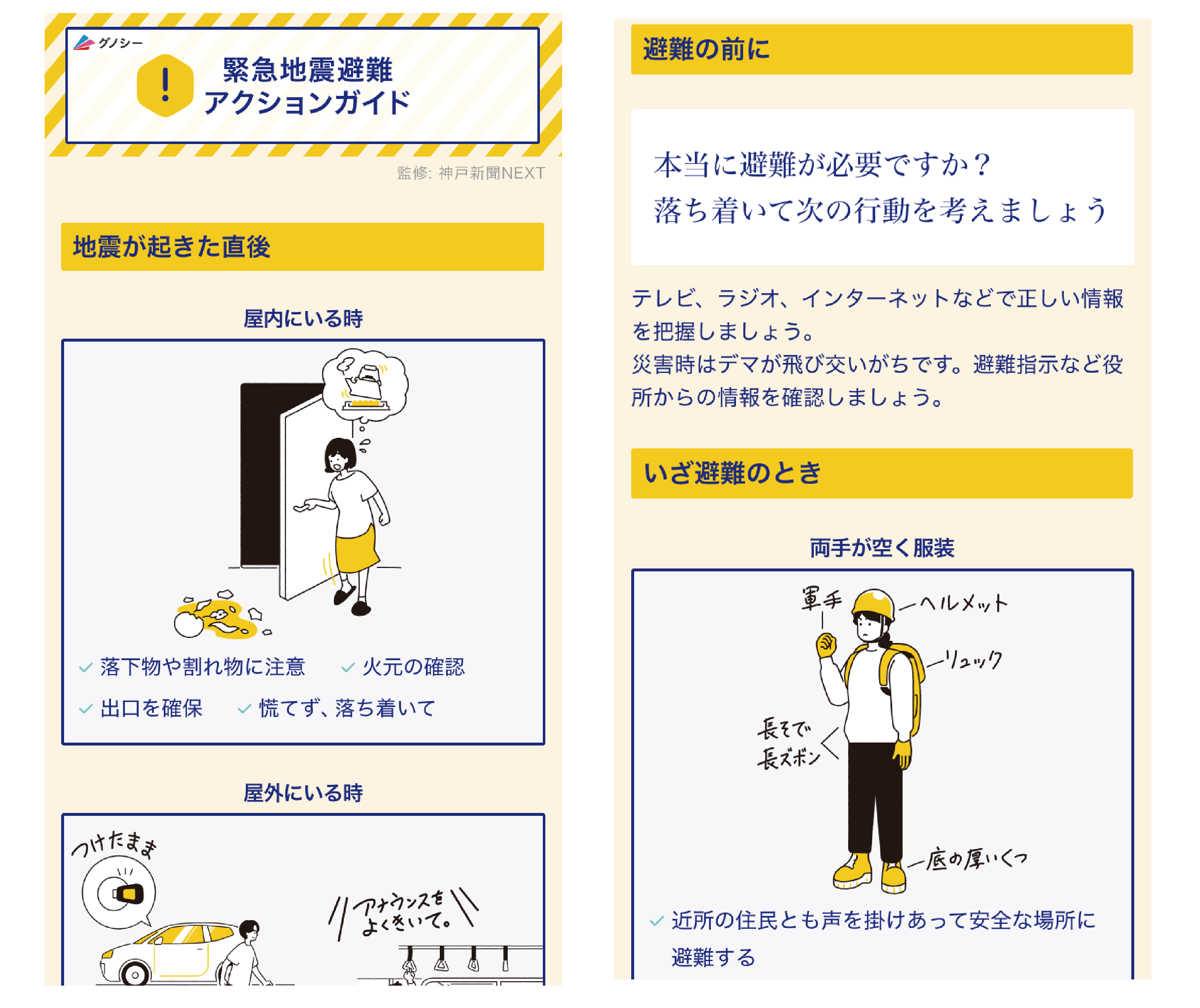 神戸新聞社監修の下、地震の際の災害ガイドを掲載いたします。阪神淡路大震災から28年間、大規模災害対応の取材を重ね、防災の啓発活動を続けてきた神戸新聞社が監修する、役立つコンテンツを掲載いたします。