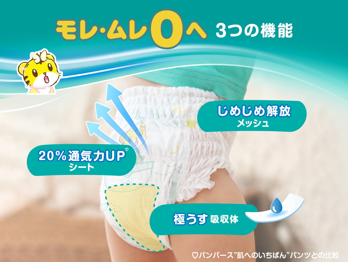 「パンパース 通気性プラス*1 パンツ」は、汗をかきやすい夏や厚着になりがちな冬、長時間の着用など、一年を通してムレが気になるあらゆるシーンに対応する、優れた通気性を備えたおむつです。パンパースが行った消費者調査*2によると、赤ちゃんのおむつ選びにおいては 9 割以上が「通気性」を重要視すると回答しています。モレだけでなく、おむつの通気性も気になるという声にお応えし、おしっこをした後でも風を通しやすい構造を採用。新しい肌ケア設計で、365日おしり快適!