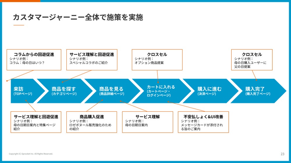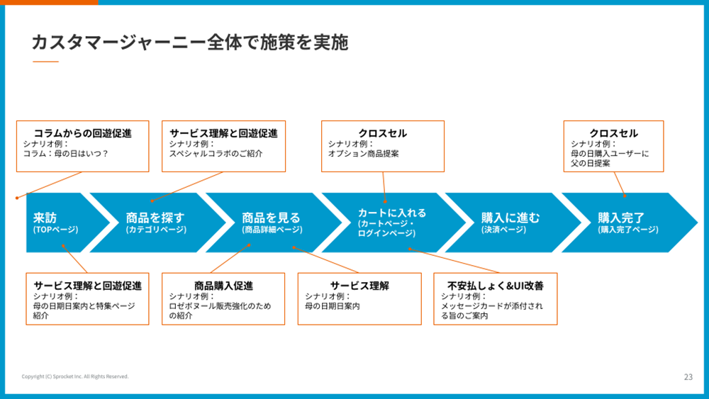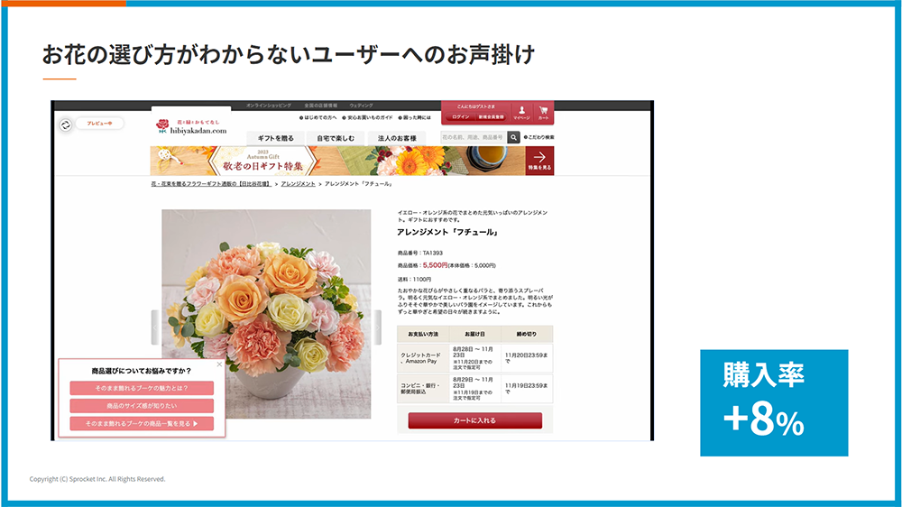 日比谷花壇の佐藤氏は、店舗スーパーバイザーと出店開発、新規事業スタートアップに携わり、現在に至ります。長らく店舗を見てきた経験上、「お店では店員が言っている“押しの一言”」をオンラインでも再現できないかという思いが強く、Web接客などのCX改善が実現できる「Sprocket」を導入しました。カスタマージャーニー全体で施策を実施しています。