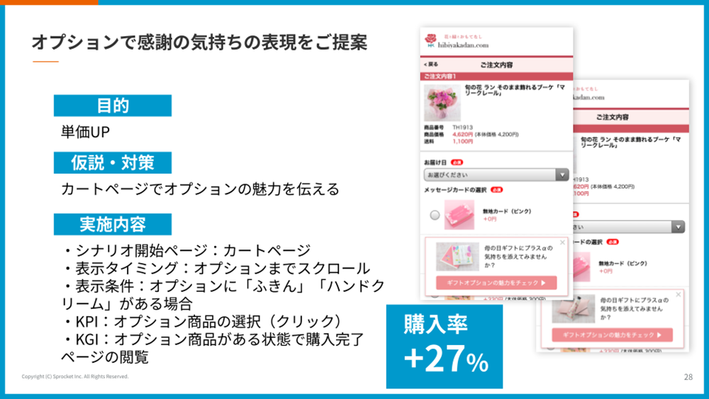 EC、特にスマホの小さな画面では魅力的なオプションがあってもその存在に気付いてもらえないことも少なくありません。この施策では、「メッセージカードで感謝の気持ちを伝えましょう」と提案することでCXを向上させ、購入率が約27%も改善しました。