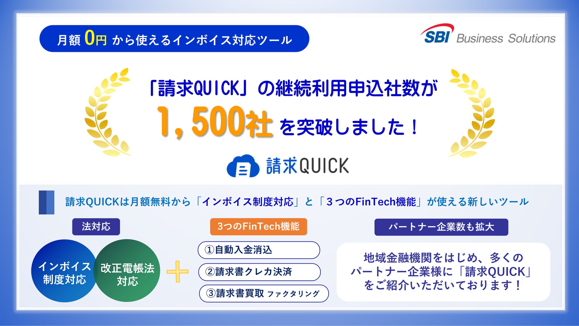 総合フィンテックソリューション企業であるSBI FinTech Solutions株式会社の子会社で、バックオフィス支援サービスを提供するSBIビジネス・ソリューションズ株式会社(本社:東京都港区、代表取締役社長:夏川 雅貴、以下「当社」)は、中小企業のインボイス制度対応をサポートするクラウド型請求書発行システム「請求QUICK」において、継続利用のお申し込み社数が1,500社を突破しましたので、お知らせいたします。