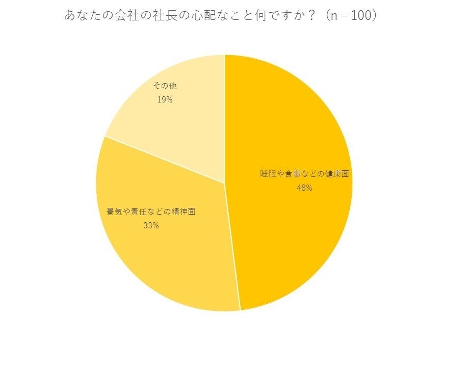 そんな背景からアンケートを実施したところ、社長の『睡眠や食事などの健康面』を心配する声が一番多く48%という結果になりました。2番目に多かった心配事が『景気や責任などの精神面』。社長に対する社員の心配事は『心よりもカラダ』というデータでしたが、社員は社長の仕事ぶりや生活スタイルをよく見ているということが推察できます。めまぐるしく変わる経済状況の中でハードワークを強いられる社長の背中は、社員が見守ってくれている。そんな温かい結果となりました。