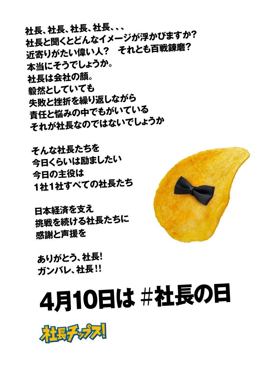 社長チップス!では、社長の日 を記念し、全国の社長に感謝と声援を贈るTwitterキャンペーンを2023年4月10日(月)朝8時過ぎ~12時頃まで行います。