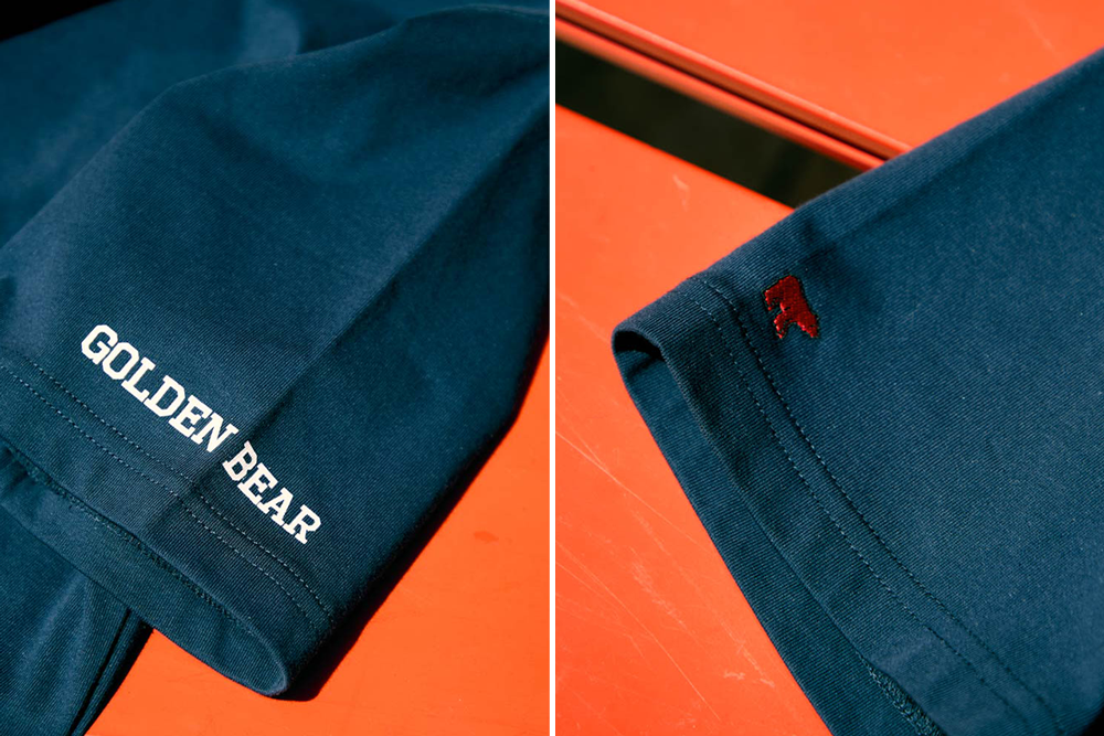 その他、両袖や襟の内側にもゴールデンベアのロゴプリントや、特別な赤いクマの刺繍をあしらいました。