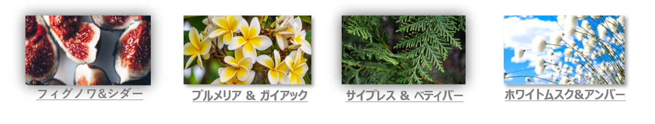- プルメリア & ガイアック: 南国らしさを演出してくれるプルメリアの甘いフローラルな香りに、スモーキーでバニラ的な香りが色鮮やかにブレンドされたフローラルウッディの深い香りを感じられます。