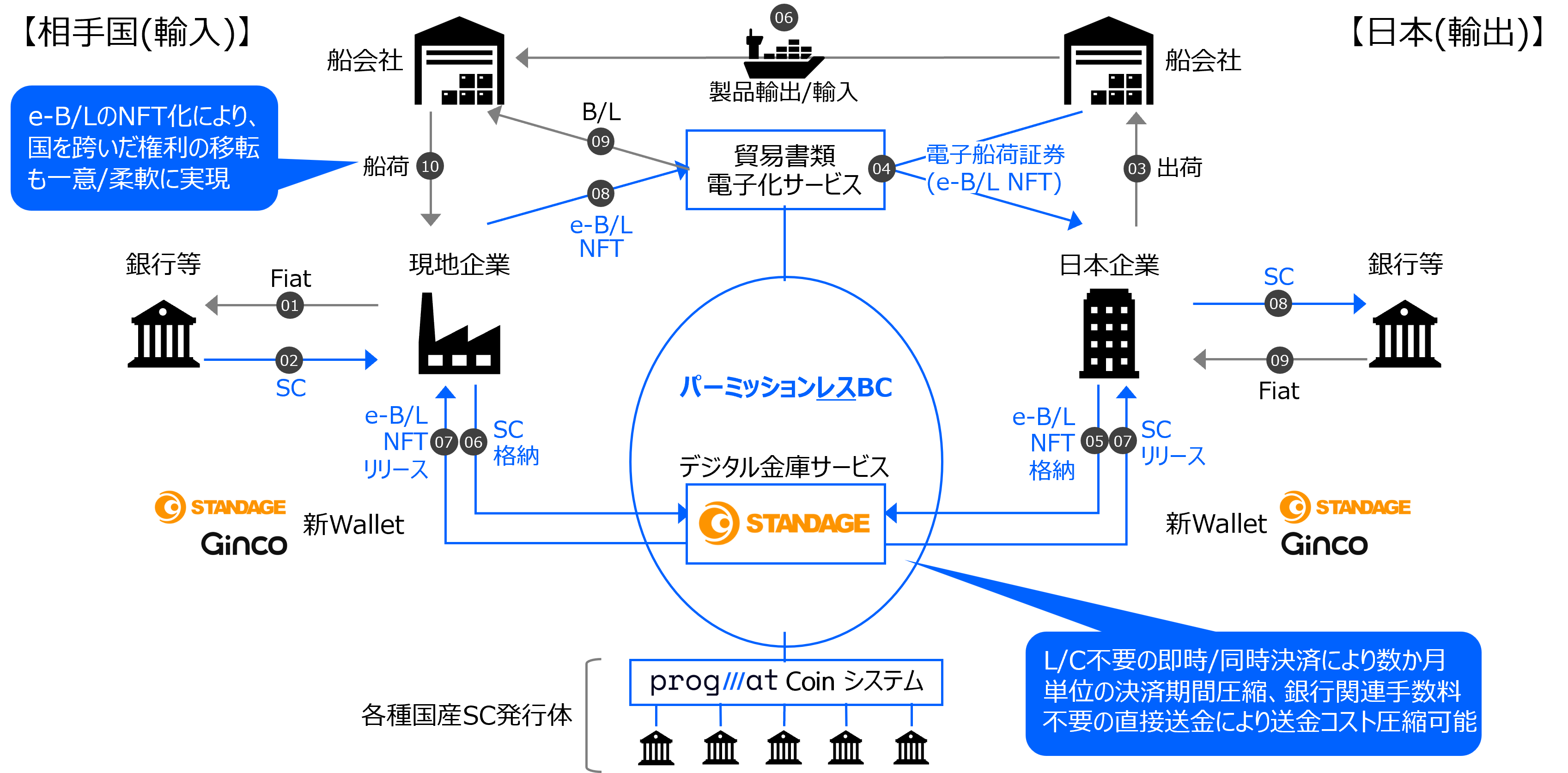 STANDAGEが2017年より開発を手掛けるブロックチェーンを活用した貿易決済システムと、「Progmat Coin」基盤との連携により、安全・迅速・確実な国際企業間決済が実現可能となります。本共同検討を通じて、1,000兆円を超える市場規模がありながら、外貨規制や信用状取引の利用制限等により、公平な米ドルベースの取引が困難を極める対新興国貿易において、2024年内に本邦初となるユースケースの創出を目指します。