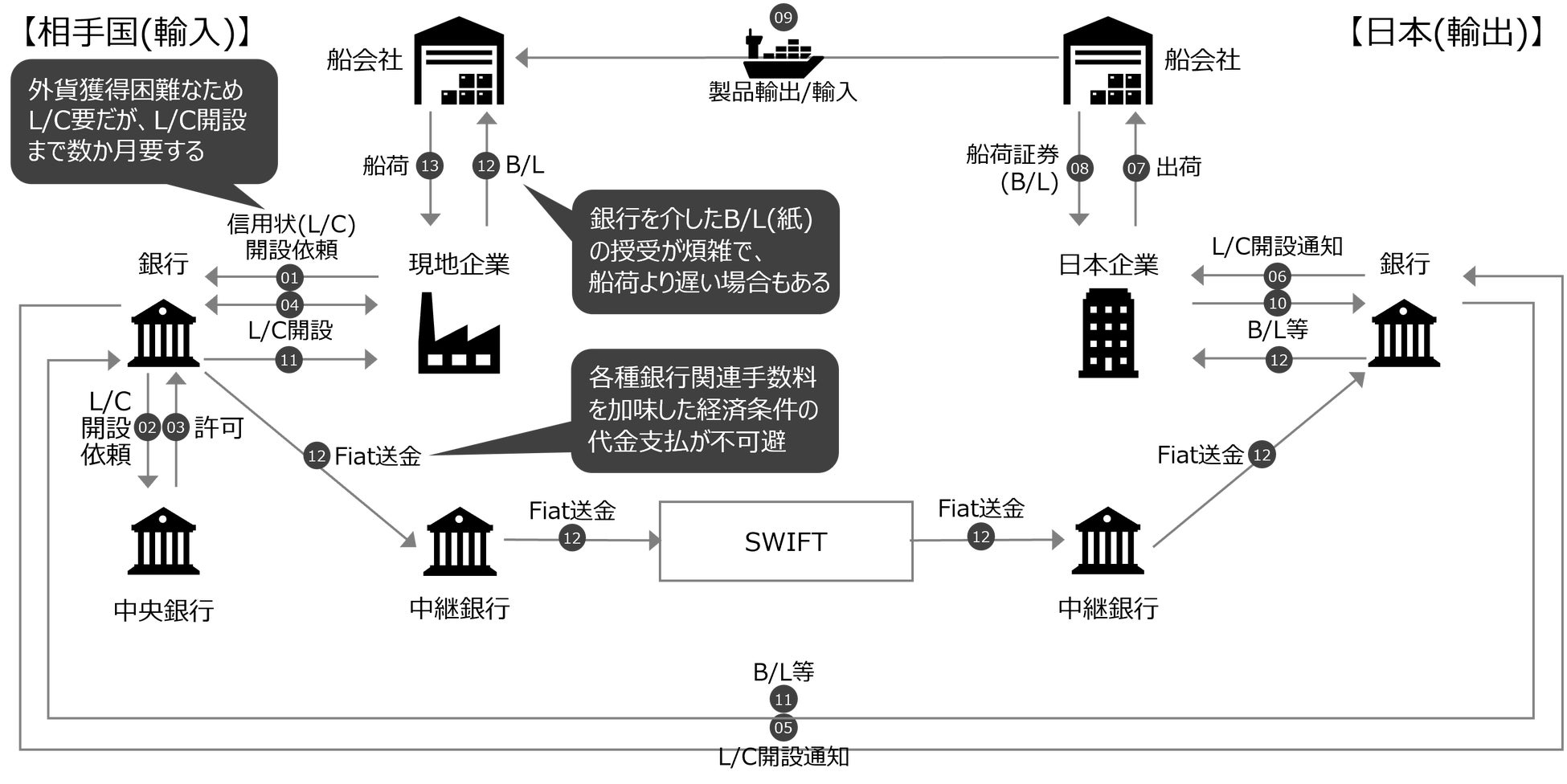 一方で、対新興国貿易の場合、1,000兆円を超える取引規模がありながら、情勢や経済制裁による外貨規制や、信用状取引の利用制限といった問題で、スムーズな米ドル決済を行うことができず、送金に数カ月もの時間がかかったり、多国・多数の銀行を経由するため手数料が嵩んだりと、不平等や不利益を抱えたまま、現在も世界中で取引が行われているのが現実です。