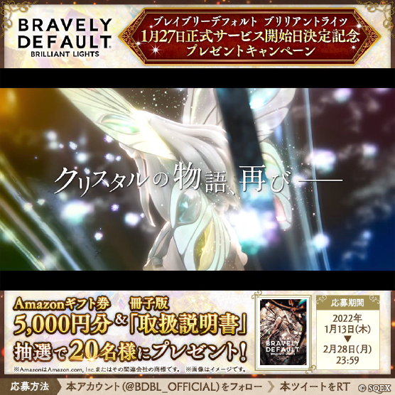 株式会社スクウェア・エニックス(本社:東京都新宿区、代表取締役社長:松田 洋祐、以下スクウェア・エニックス)は、事前登録受付中の「ブレイブリー」シリーズのスマートフォン向け最新作『ブレイブリーデフォルト ブリリアントライツ』(BRAVELY DEFAULT BRILLIANT LIGHTS)(以下BDBL)において、正式サービス開始日が2022年1月27日(木)に決定したことをお知らせいたします。