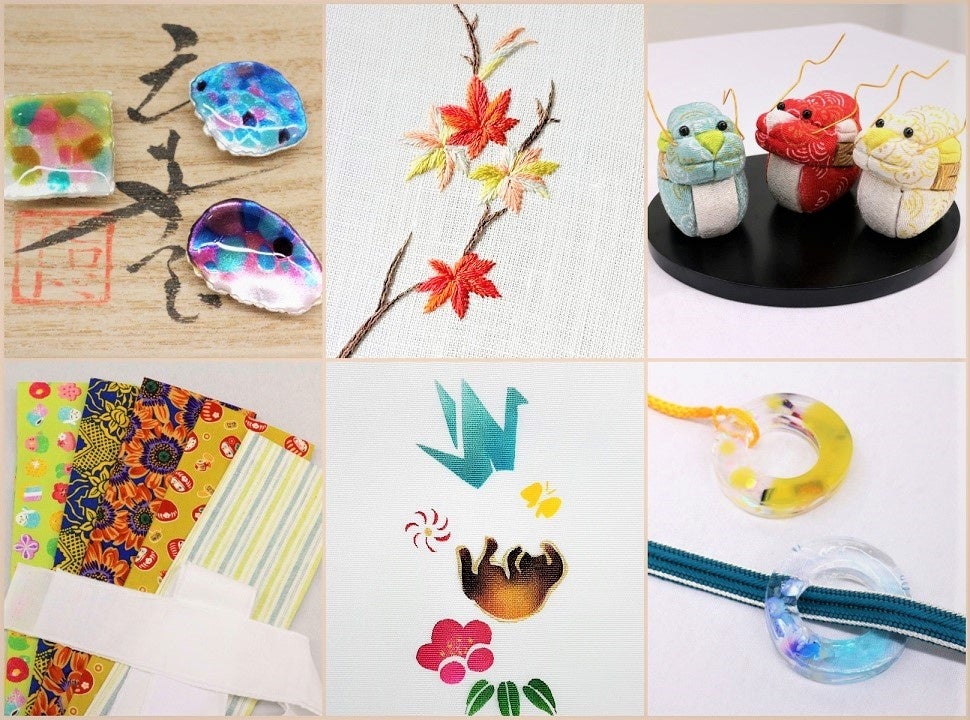 半衿の本格友禅染め/木目込人形づくり/ミルフィオリの帯留づくり/天然石の羽織紐づくり/着物パーソナルカラー診断/和のヘアセット講座/丸ぐけの羽織紐づくり/京七宝の帯留づくり/はじめてのお能講座 など多数