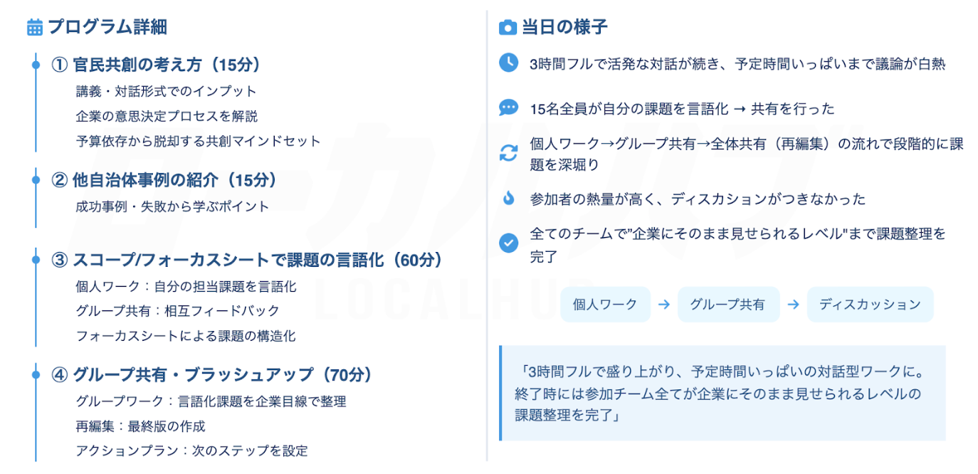 今回のワークでは、課題の書き方ひとつで企業の見え方が変わることを体感していただけたと思います。完璧な整理よりも“開くこと”が第一歩。ローカルハブを使えば、その一歩を誰でも簡単に踏み出せます。ぜひ気軽に活用してください。