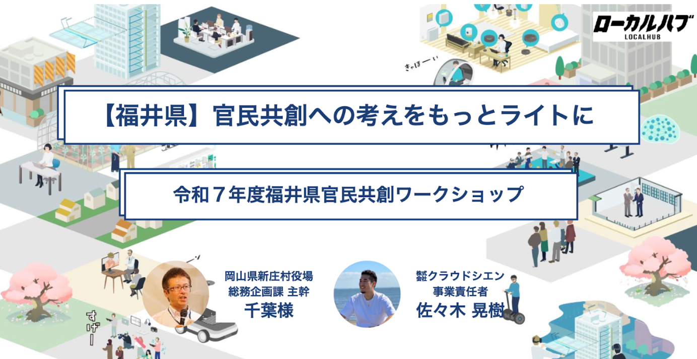 自治体と民間企業の共創を支援するプラットフォーム「ローカルハブ」を提供する株式会社クラウドシエン(本社:広島県広島市、代表取締役:神原 翔吾)は、2025年10月29日、福井県庁にて「ローカルハブ式 官民共創ワークショップ」を開催しました。本ワークショップは、岡山県新庄村で官民共創を推進する現役職員が監修・登壇し、自治体と企業が互いの立場を理解し合いながら“持続可能な連携”を構築するための新たな手法を学ぶ機会として実施されたものです。