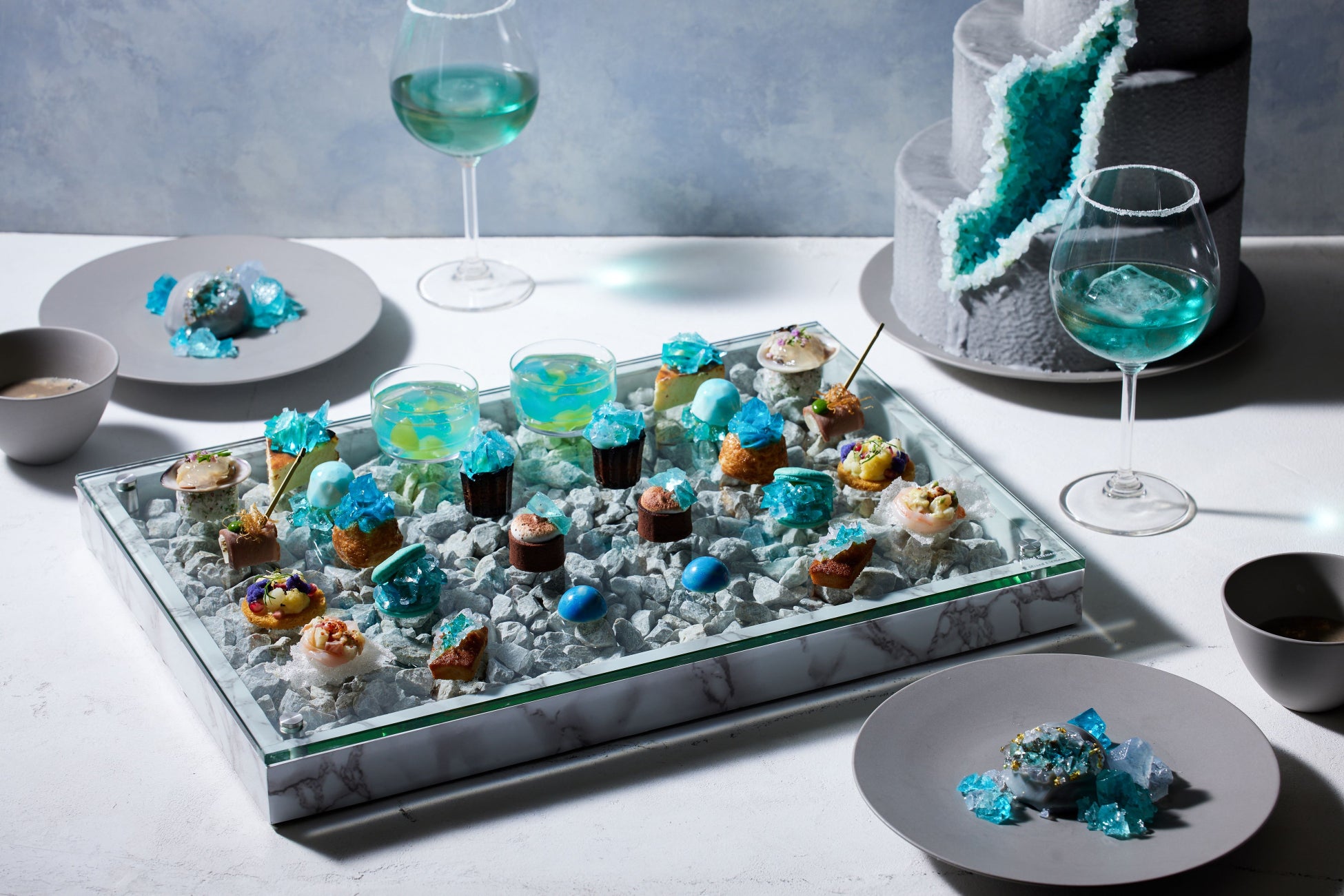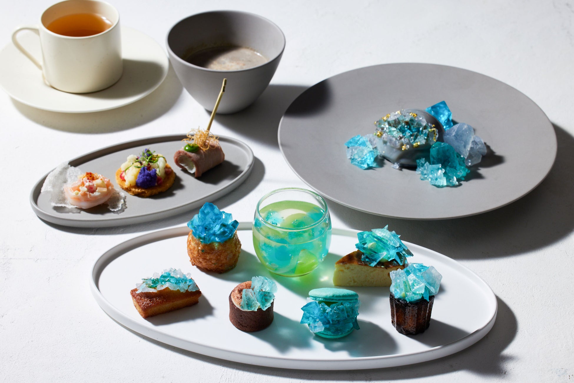 食べる宝石として海外で話題のジオードケーキをはじめ、プレート上に展開するスイーツには琥珀糖などを散りばめ、スイーツひとつひとつを宝石に見立てました。煌めく青のスイーツが整列するその姿は、宝石箱を彷彿とさせます。セイボリーにも、蛤や鴨など贅沢な食材をふんだんに使用しました。