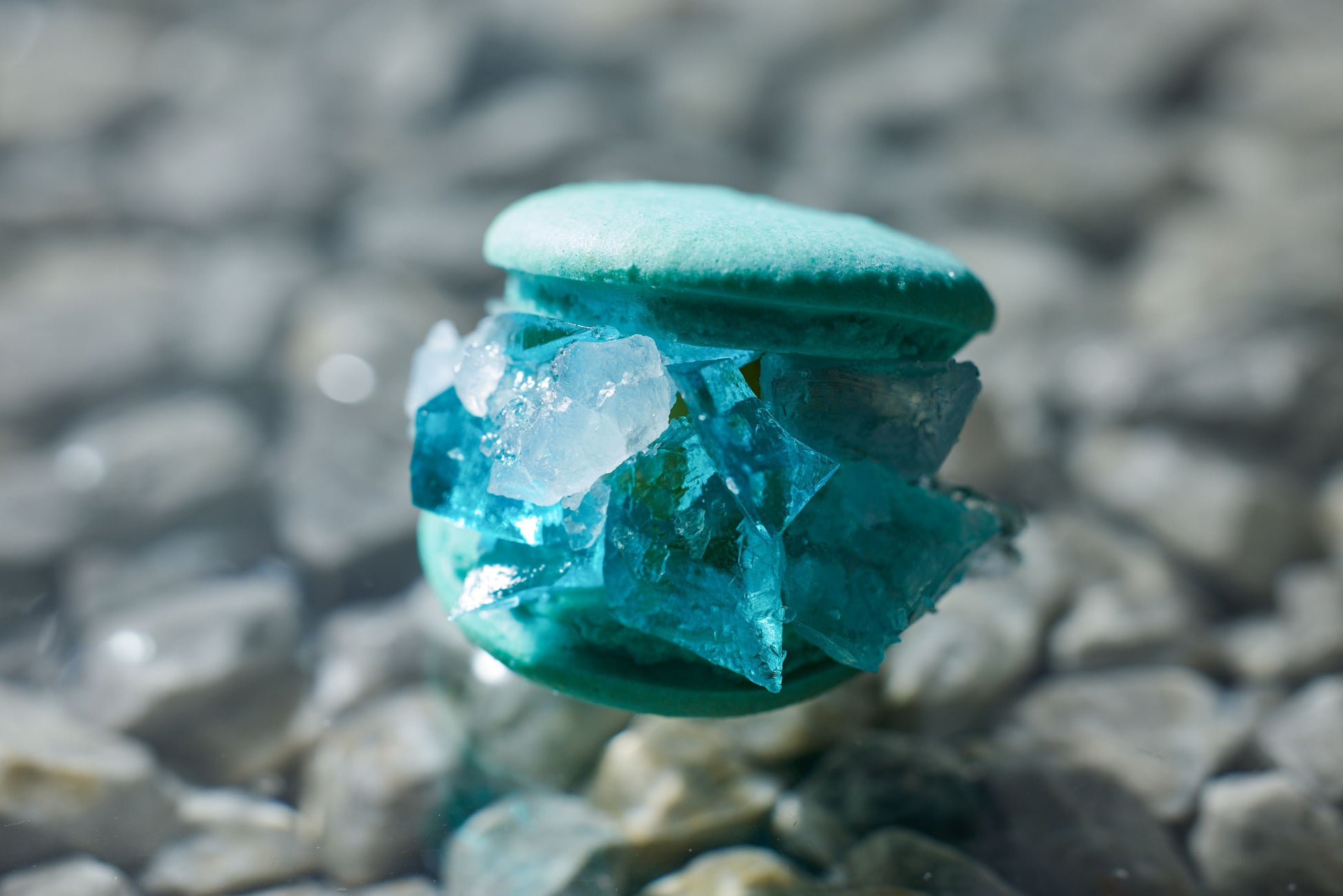 甘酸っぱいラズベリージャムと、上品な香りの薔薇のクリームをたっぷりサンドしたマカロンです。ぽってりとした愛くるしい見た目が人気の韓国スイーツ、トゥンカロンをイメージしました。表面に散らされた薔薇味の琥珀糖が、華やかに煌めきます。