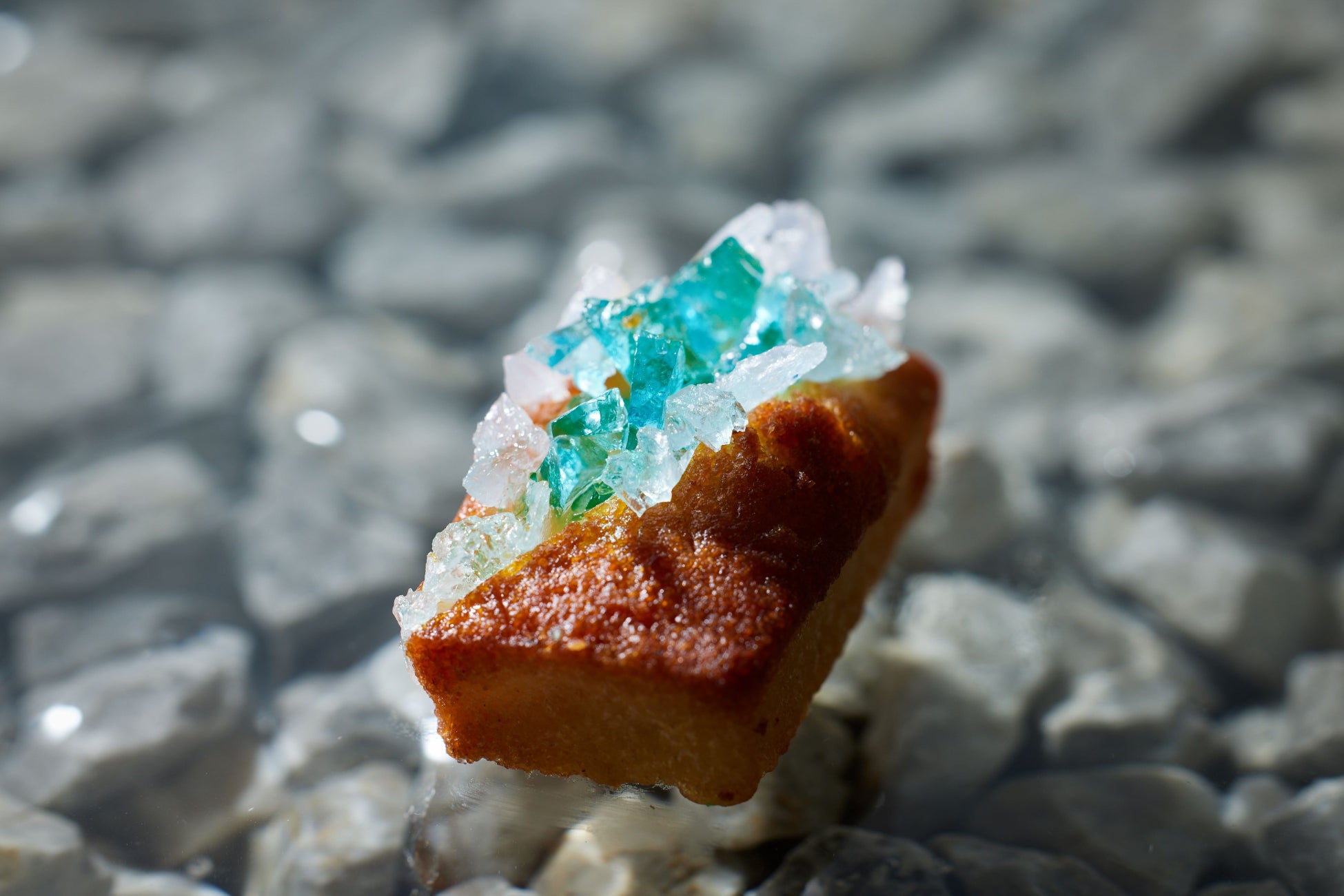 ラム酒とオーガニックシュガー、オーガニックバニラビーンズを使用したシンプルな大人のカヌレです。ダークな焼き色に、ラム酒で味付けされた透き通ったブルーの琥珀糖が映えています。鉱山の中で輝く宝石のようにも見える、当アフタヌーンティーでしか出会えない特別な一品です。