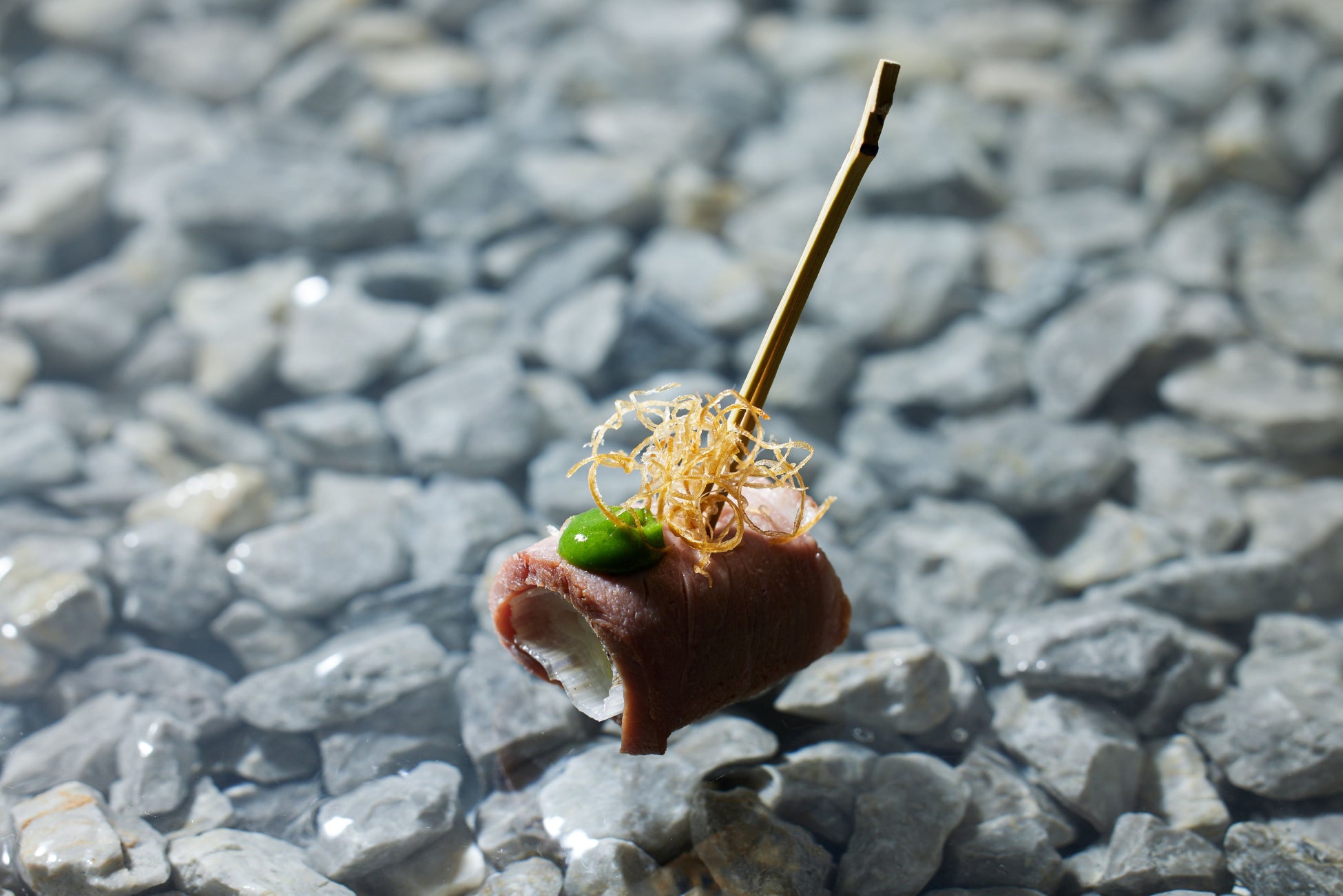 低温調理した合鴨胸肉と長葱を合わせたピンチョスタイプのセイボリーです。長葱はロースト・ピューレ・フリットで調理をし、それぞれのスタイルで最大限に甘みと旨みを引き出します。相性抜群と名高い2つの食材のコンビネーションをお楽しみください。