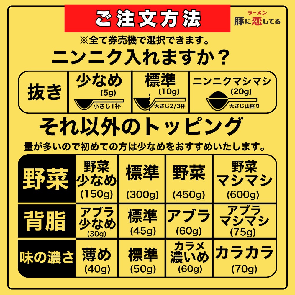 ニンニクや野菜の量、脂の加減まで、全て券売機で簡単に選べるシステムを採用。スムーズに注文できる便利さで、忙しいライフスタイルにもぴったり。自分好みの一杯を手軽にカスタマイズして楽しめます。