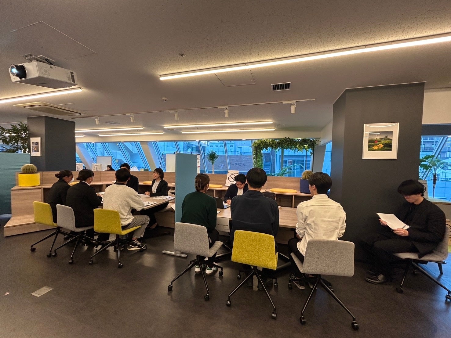 オープニングで作成し、キャリアアドバイザーからアドバイスを受け改善した自己PR文を手に、それぞれの斑に分かれて企業との面接を行いました。