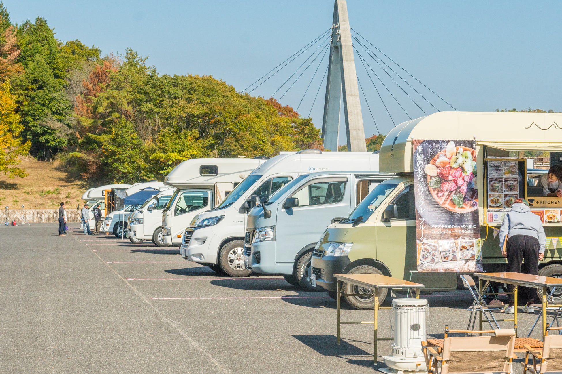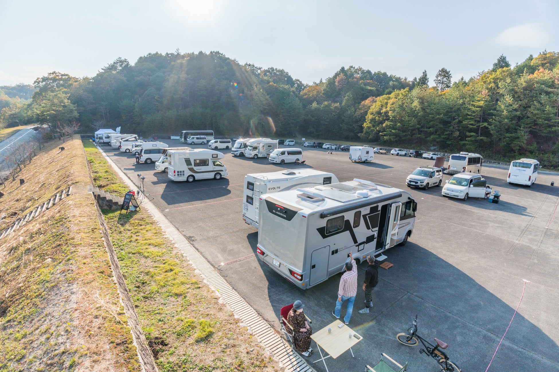 中型から大型バス、トラック、バン、軽ワゴンなどの車両をベースにしたキャンピングカーや車中泊仕様の「バスコン」「キャブコン」「バンコン」「軽キャンパー」、軽トラックの荷台に自作DIYの“部屋”を積んだ「軽トラハウス」など、広島県だけでなく、熊本県、愛知県、京都府、石川県、神奈川県、東京都などから家族、夫婦、親子、ペット連れなどの旅人が乗る多種多様の車が、毎週末、約10~30台 集まりました。