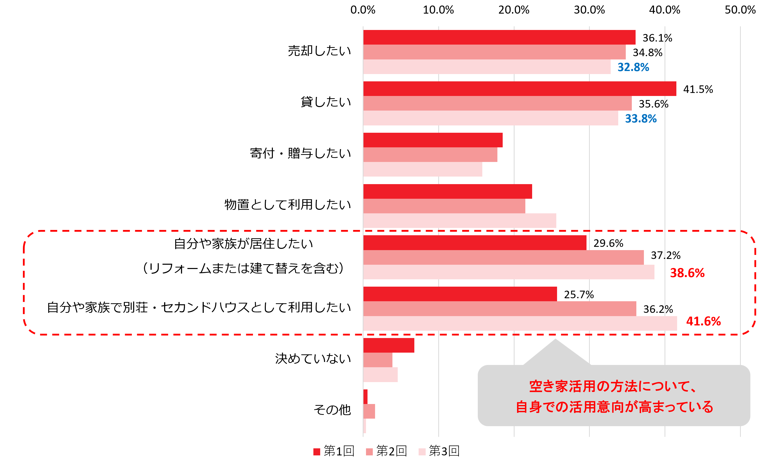 さらに、3回の調査を通して、「別荘・セカンドハウスとして利用」と回答した所有者の割合は25.7%→36.2%→41.6%、「自分や家族が居住」は29.6%→37.2%→38.6%と意向が高まっている。