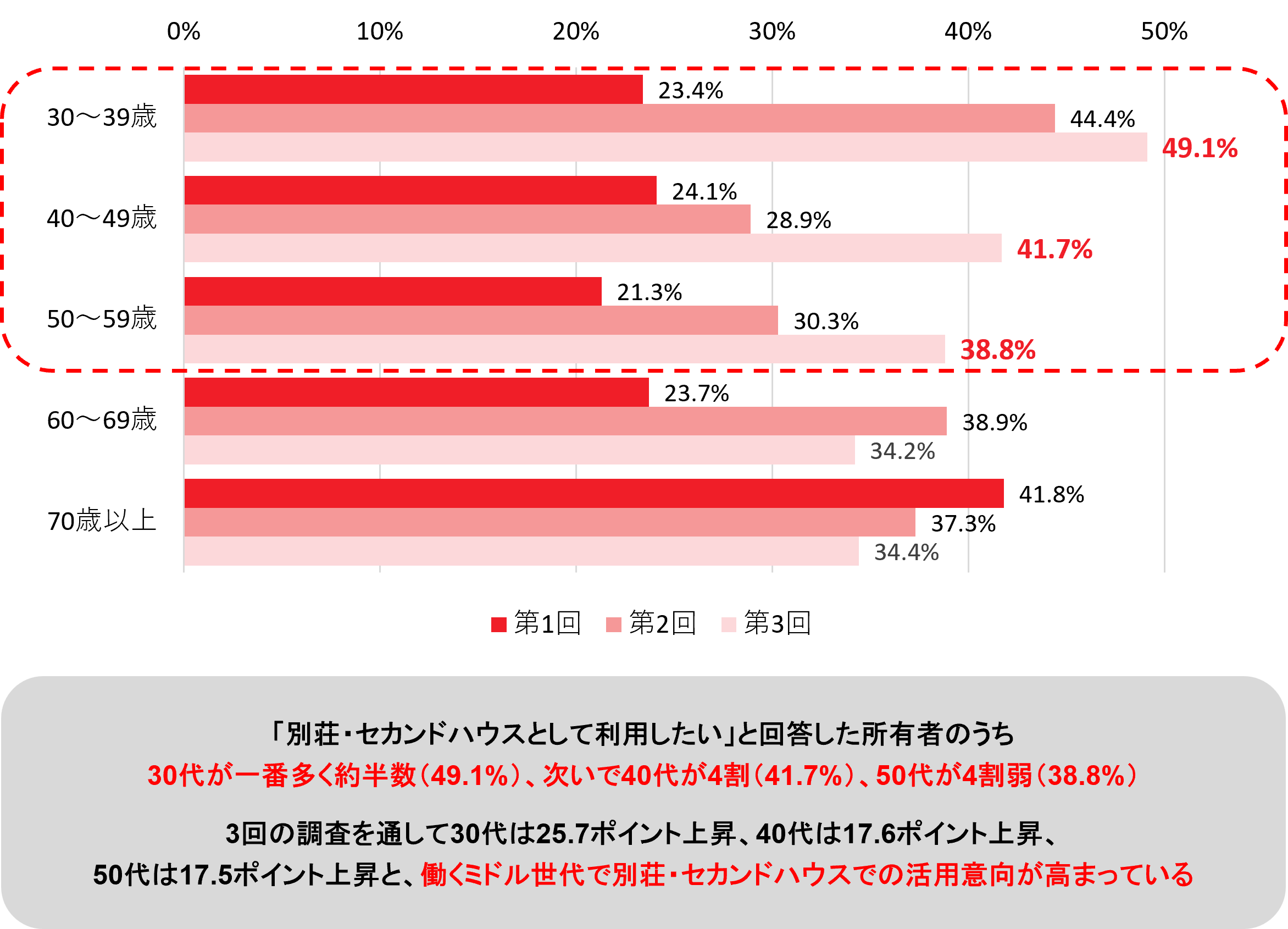 Q2の質問に対して「別荘・セカンドハウスとして利用したい」と回答した所有者を年代別で見てみると、第1回調査では70代以上が一番多く4割(41.8%)、40代が2割強(24.1%)、60代が2割(23.7%)であったのに対し、本調査では30代が一番多く約半数(49.1%)、次いで40代が4割(41.7%)、50代が4割弱(38.8%)という結果となりました。