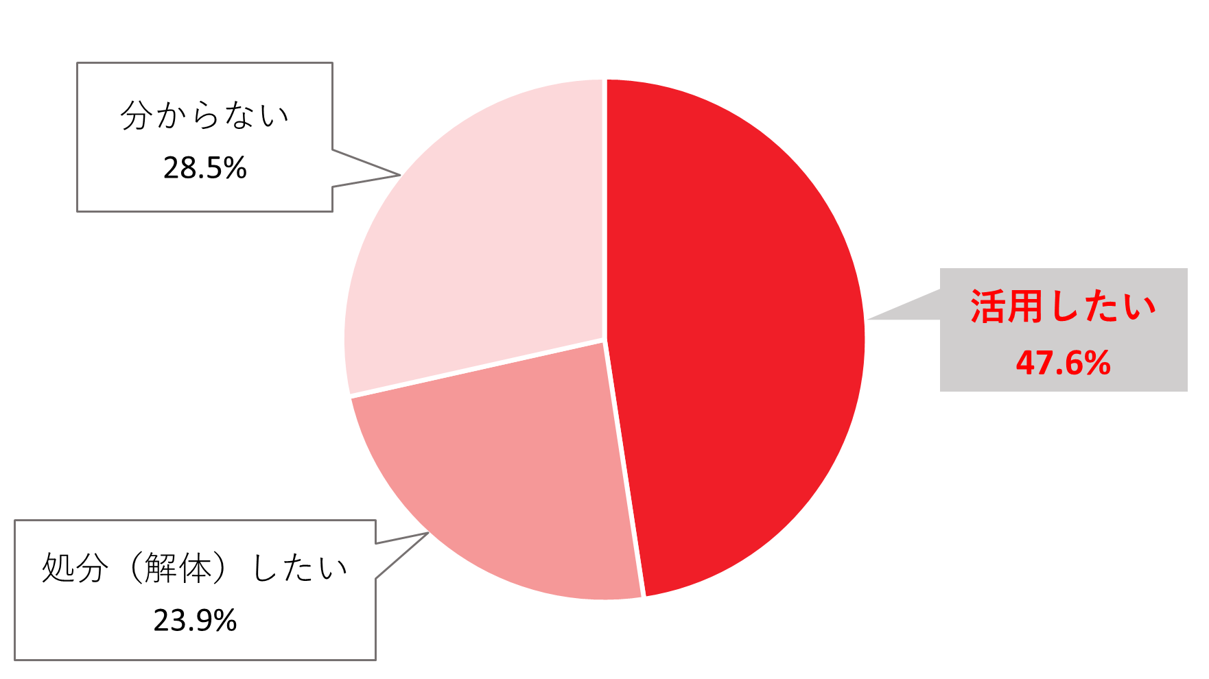 本調査の結果から、空き家を「活用したい」と回答した所有者が5割弱(47.6%)、「処分(解体)したい」と回答したのが2割強(23.9%)、「分からない」と回答したのが3割弱(28.5%)であり、活用の意向が最も高い結果となりました。