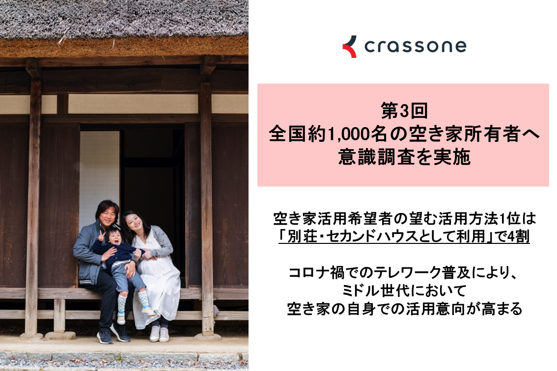 解体工事の一括見積もりWebサービスを運営する株式会社クラッソーネ(名古屋市中村区、代表取締役 川口哲平、以下クラッソーネ)は、空き家を所有する30歳以上の男女1,051名に対して、2021年8月、2022年1月の実施に引き続き、2022年10月に3回目となる「空き家に関する意識調査」を実施しました。